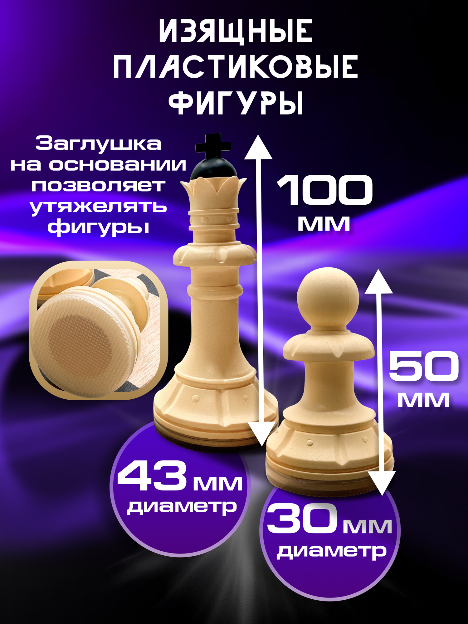 Фигуры выполнены из пластмассового композита, который не только придает им изящность и красоту, но и гарантирует их долговечность и прочность. Высота короля составляет 112 мм, что делает эти шахматы идеальными для семейных поединков или для подарков особым людям в вашей жизни.