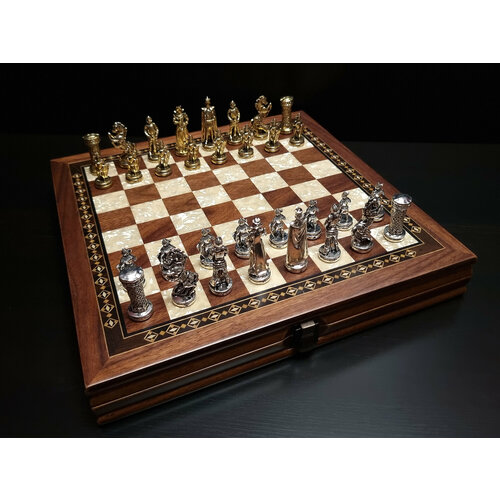 Шахматные фигуры - бронзовые литые, укладываются в индивидуальные ячейки. Фигуры выполнены в виде древнеримских воинов.