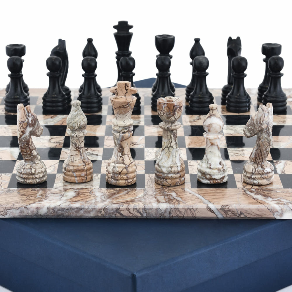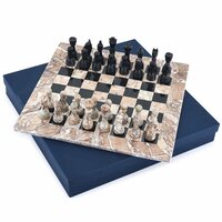 В комплекте: короб; доска для игры в шахматы из мрамора; фигуры по 16 шт. из черного и розоватого мрамора - полный набор как для игры, так и для подарка.