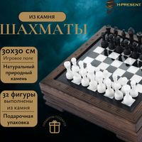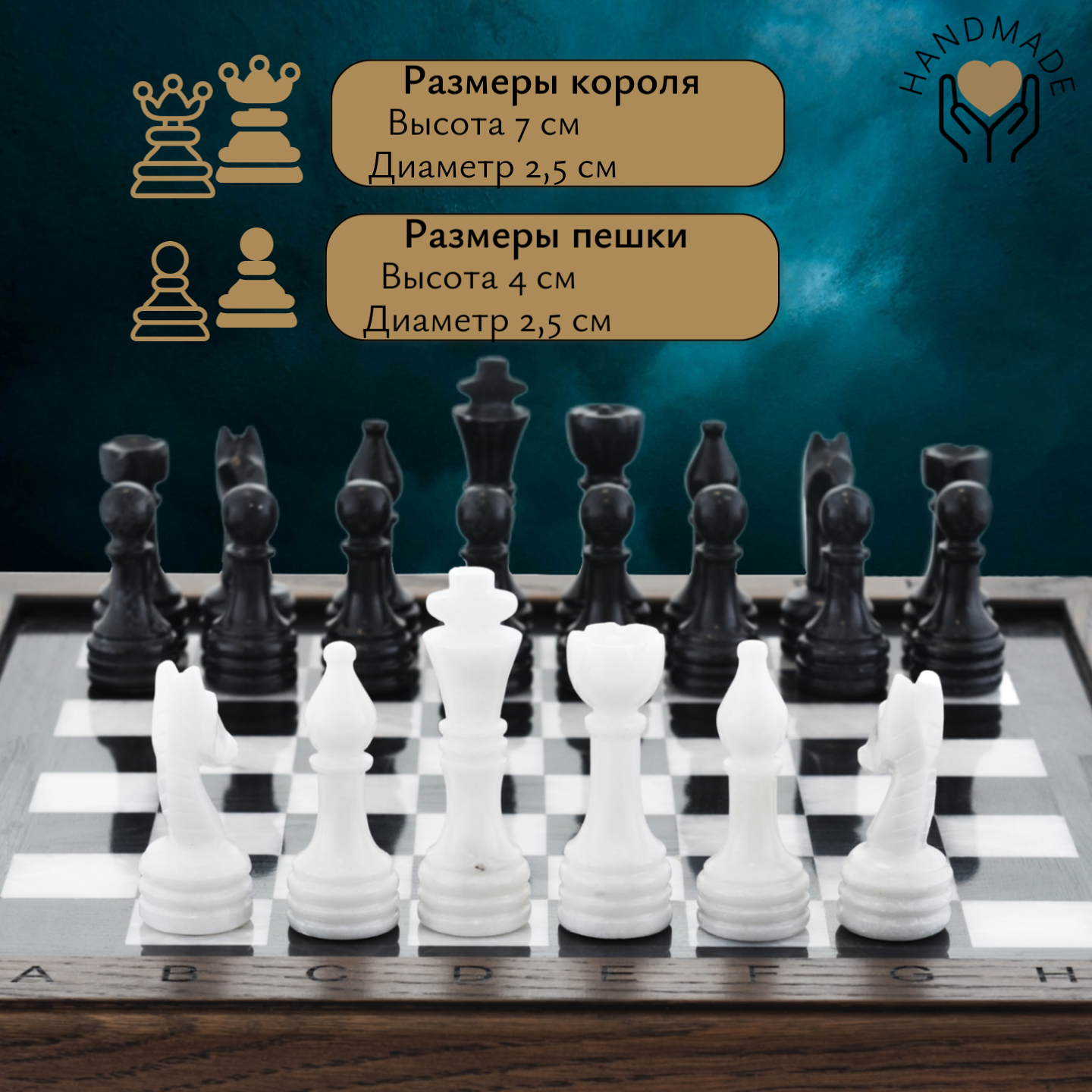 В комплекте: доска для игры в шахматы из мрамора и дерева; фигуры из мрамора по 16 шт. белого и черного оттенка - полный набор как для игры, так и для подарка!