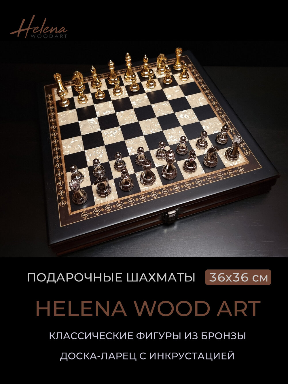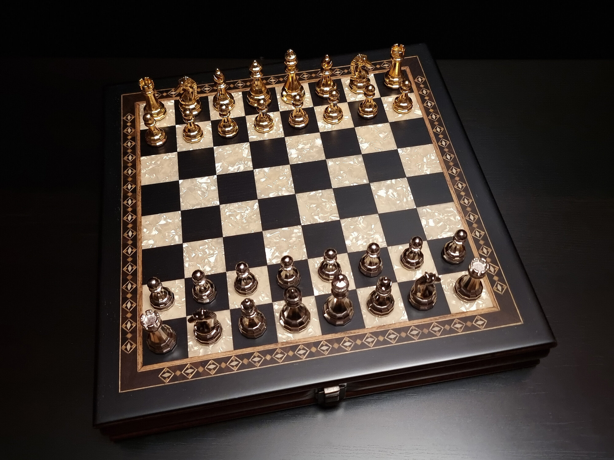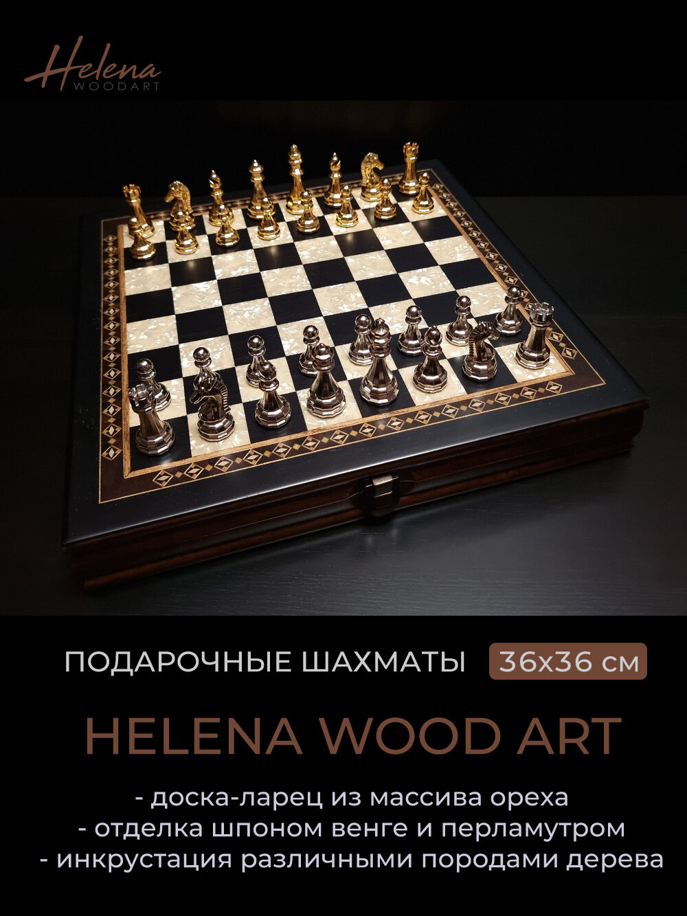 Шахматная доска изготовлена из ореха и украшена инкрустацией из различных пород дерева и перламутра. Поверхность отделана шпоном венге, отполирована и покрыта матовым лаком.