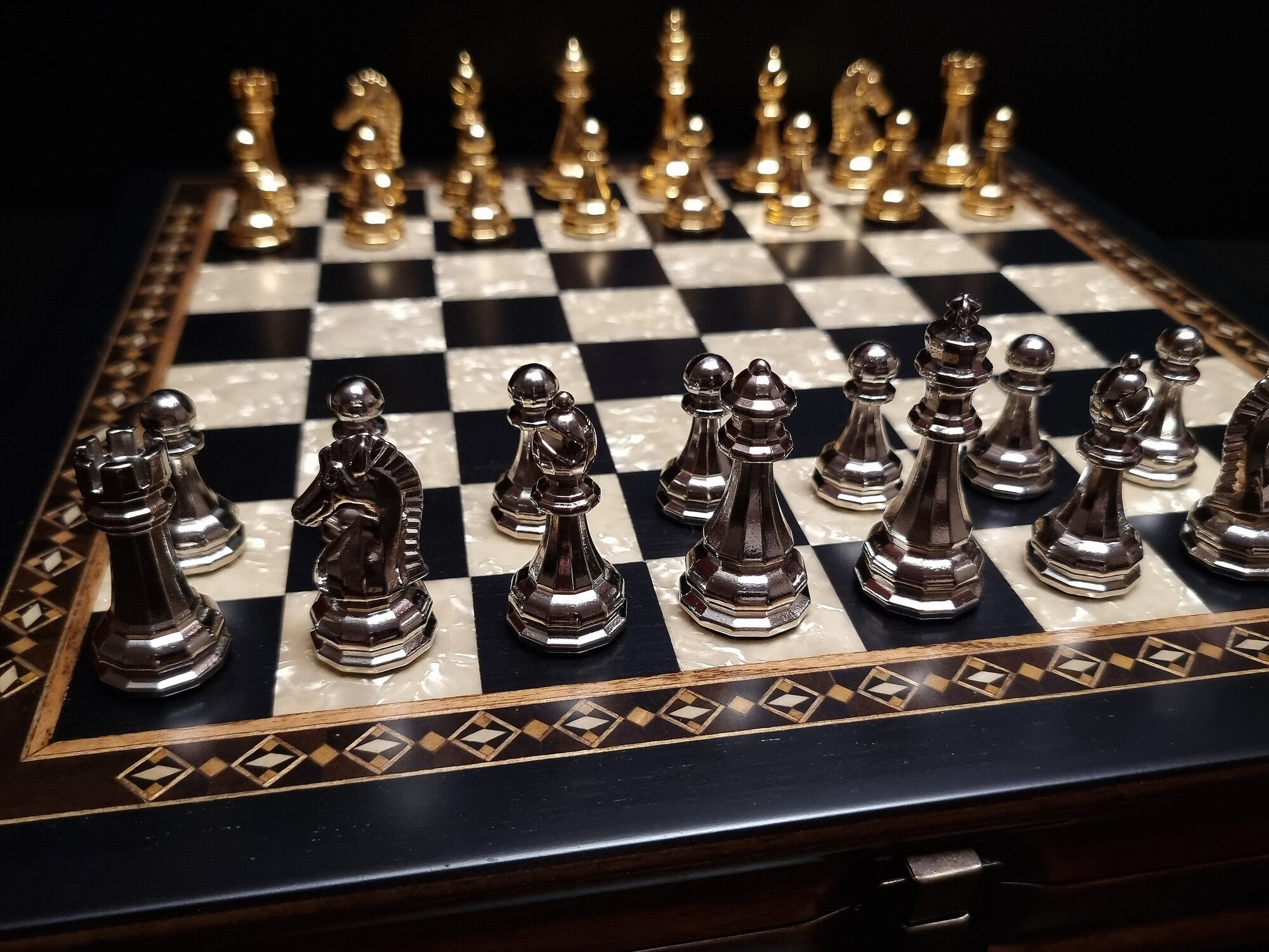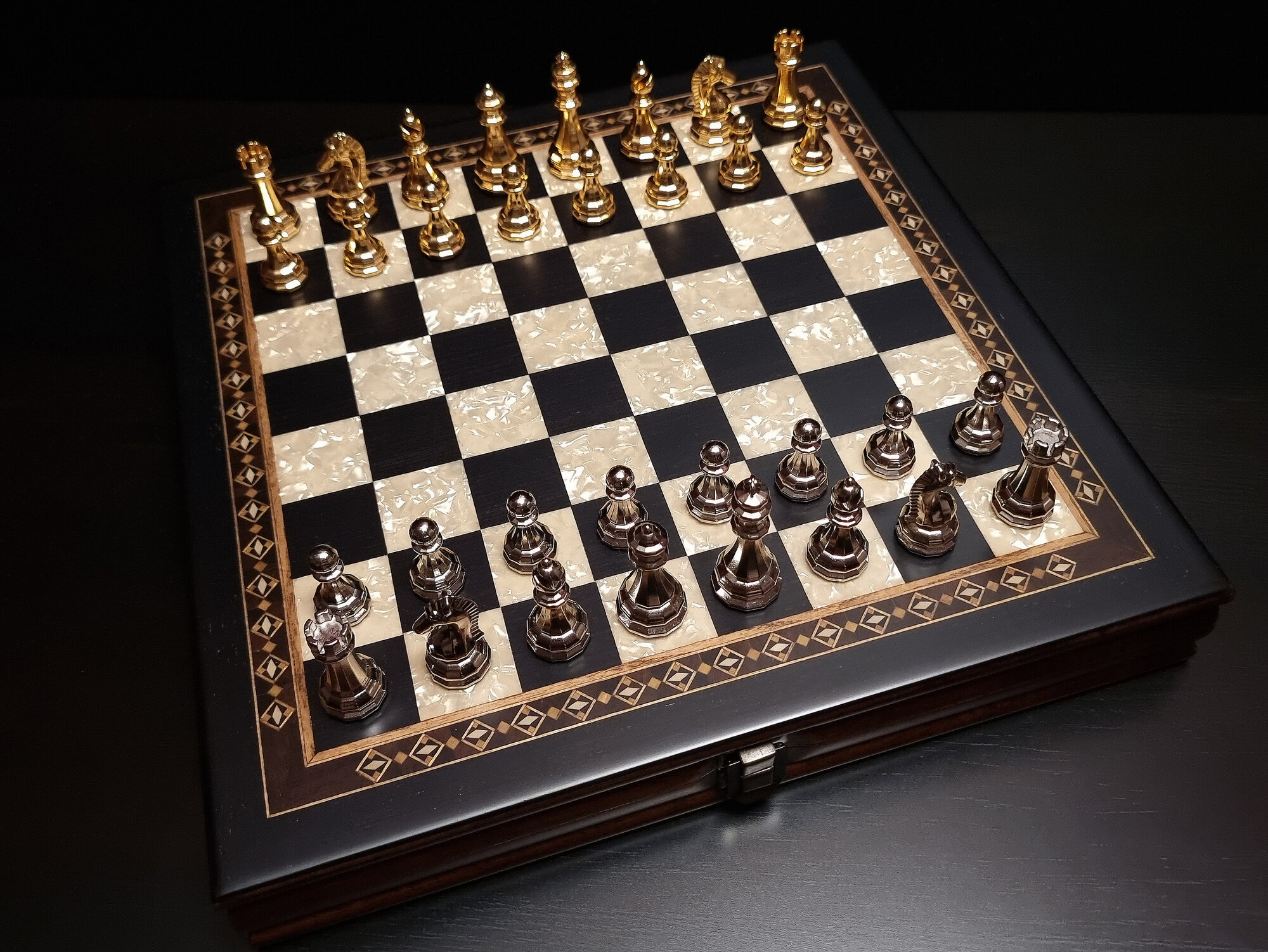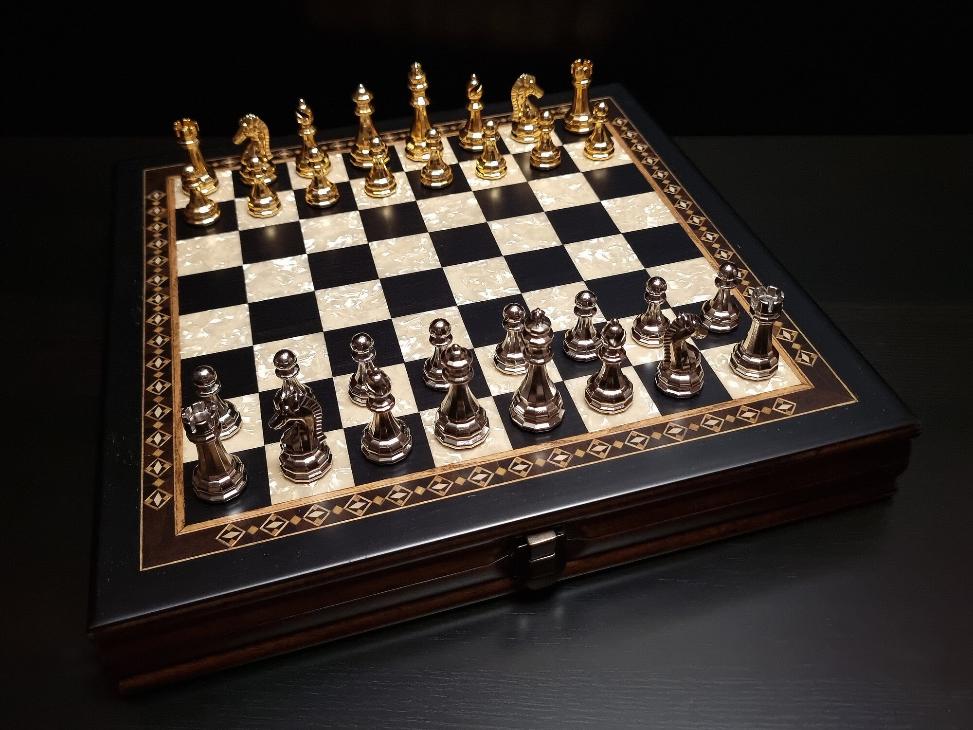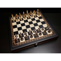 Шахматная доска изготовлена из ореха и украшена инкрустацией из различных пород дерева и перламутра. Поверхность отделана шпоном венге, отполирована и покрыта матовым лаком.