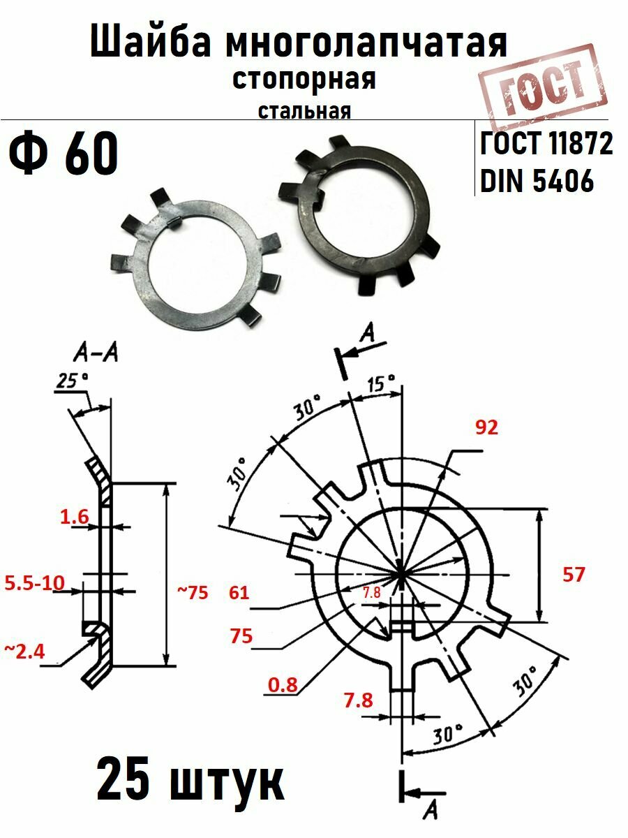 Шайба Ф60 многолапчатая ГОСТ 11872, DIN 5406 сталь 25 шт: сравнение цен, характеристики, фото, актуальное наличие и цены.