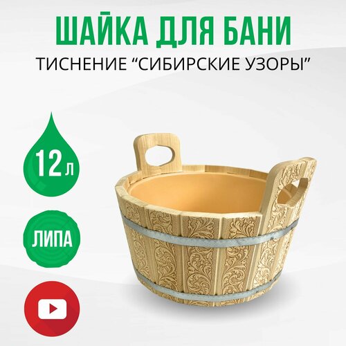 Купить Шайка для бани и сауны с тиснением 12 литров «Сибирские узоры» круглая с пластиковой вставкой, ушат из липы запарник для веника, ДваДома DBB0101 с доставкой по всей России.