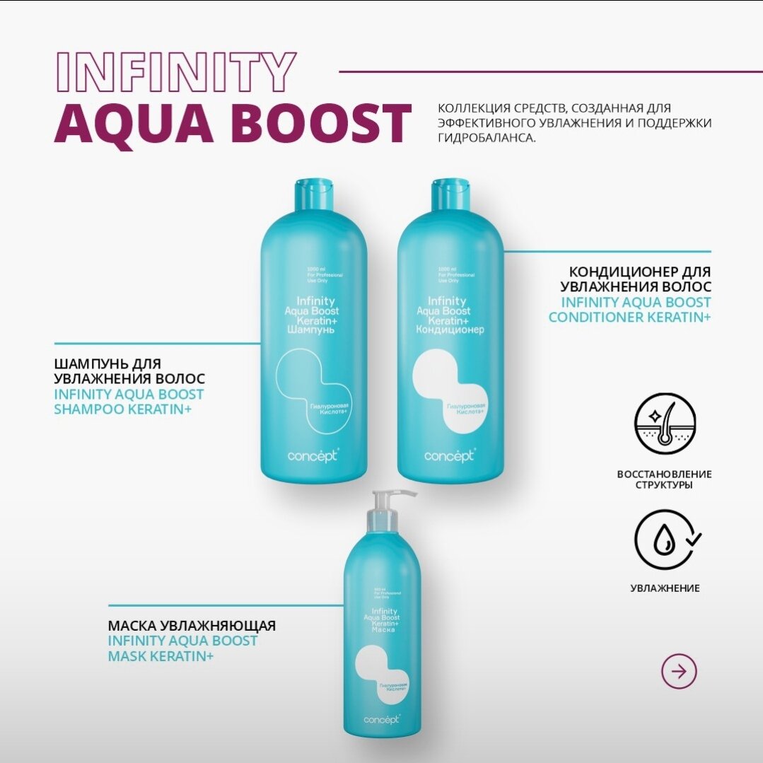Купить Шампунь Concept «Infinity Aqua Boost Keratin+» для волос, увлажняющий, 1000 мл с доставкой по всей России.