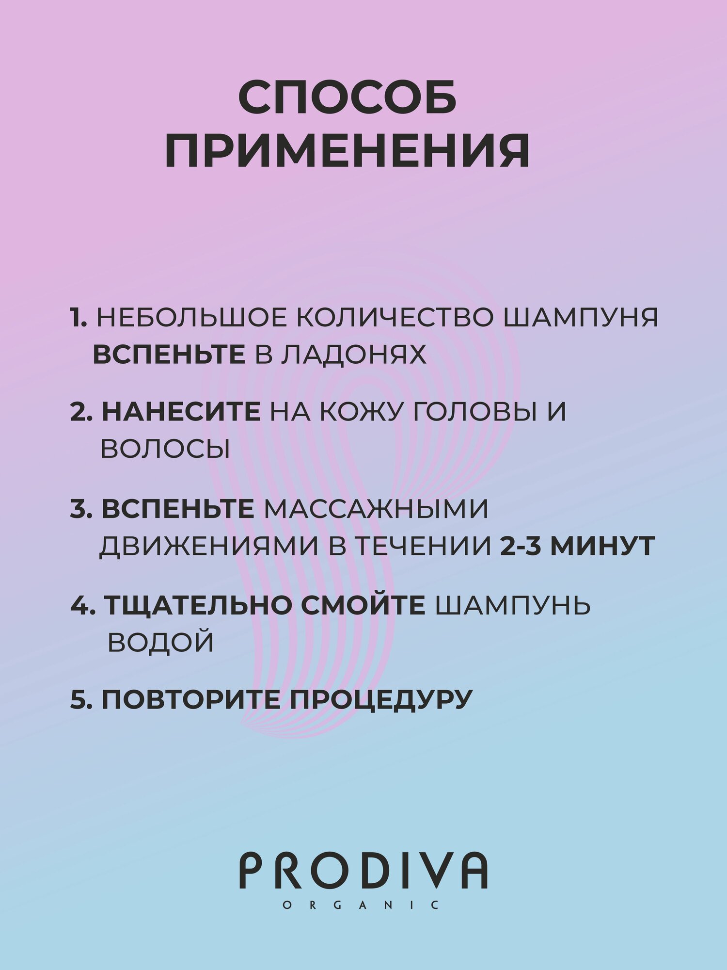 1. Небольшое количество шампуня вспеньте в ладонях 2. Нанесите на кожу головы и волосы 3. Вспеньте массажными движениями в течении 2-3 минут 4. Тщательно смойте шампунь водой 5. Повторите процедуру