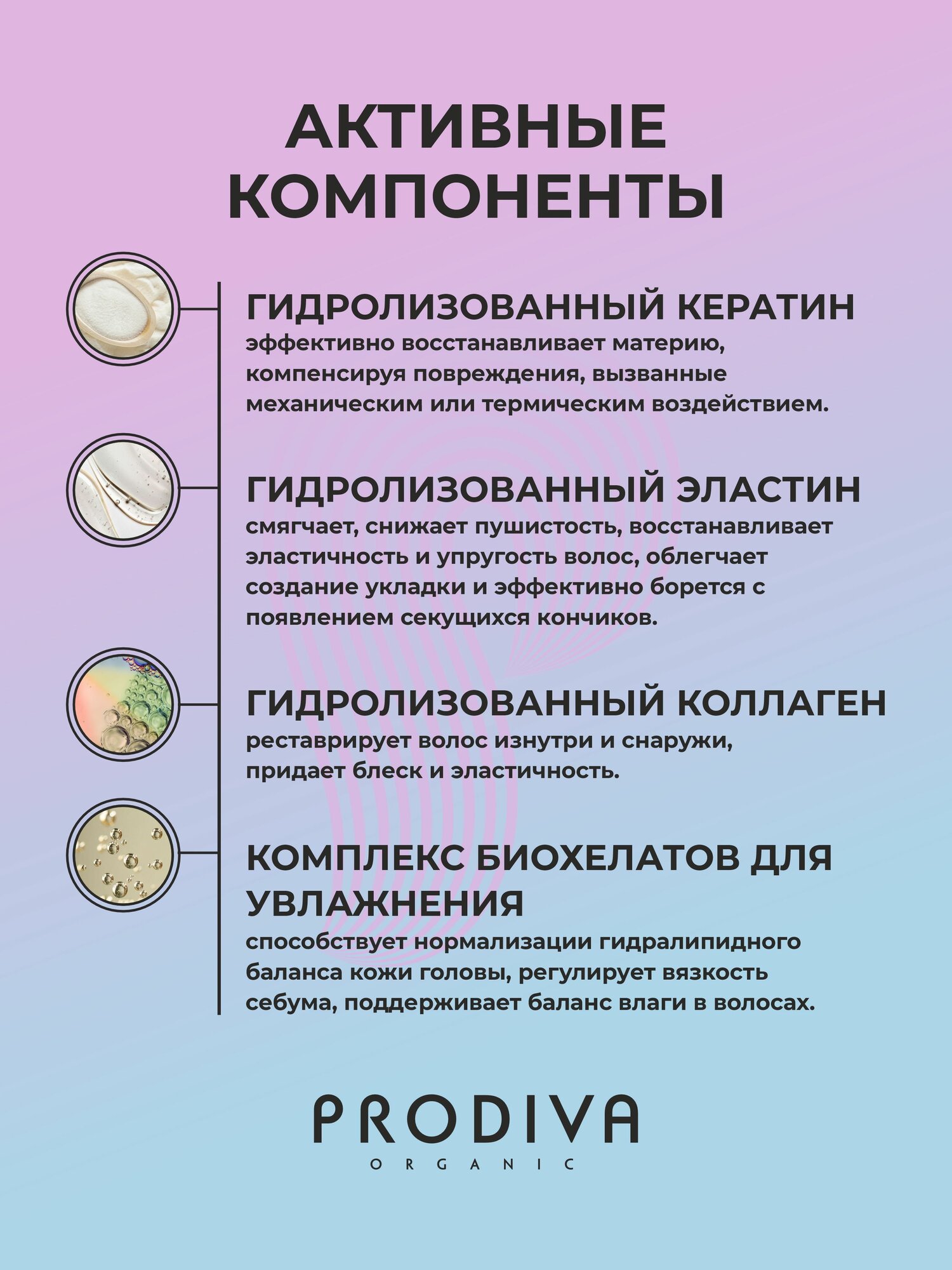 восстановление, защита цвета, питание, придание эластичности, увлажнение
