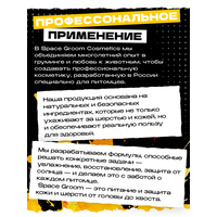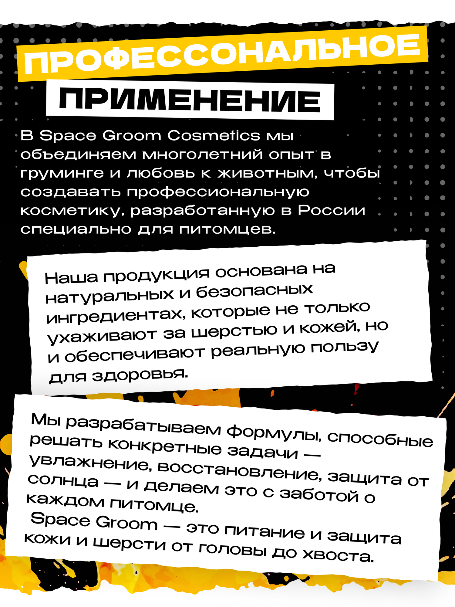 Предварительно развести в тёплой воде необходимое количество шампуня в пропорции до 1:20 в зависимости от типа шерсти животного, массирующими движениями нанести на хорошо смоченную шерсть и вспенить, смыть тёплой водой. Далее развести в тёплой воде необходимое количество кондиционера в пропорции до 1:10. После применения шампуня, на чистую влажную шерсть мягкими и массирующими движениями нанести кондиционер, равномерно распределить, уделяя внимание проблемным зонам, оставить на 3-4 минуты, смыть тёплой водой. Не сушит руки. Подходит для частого применения. Распылить парфюм Space Groom на шерсть животного с расстояния 15/20 см, избегая попадания в глаза. Домашний груминг закончен!