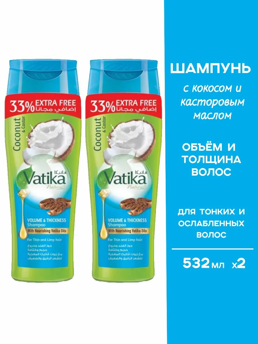 Шампунь для толщины и объёма волос с кокосом 2 шт. по 532 мл (Vatika Volume & Thickness): сравнение цен, характеристики, фото, актуальное наличие и цены.