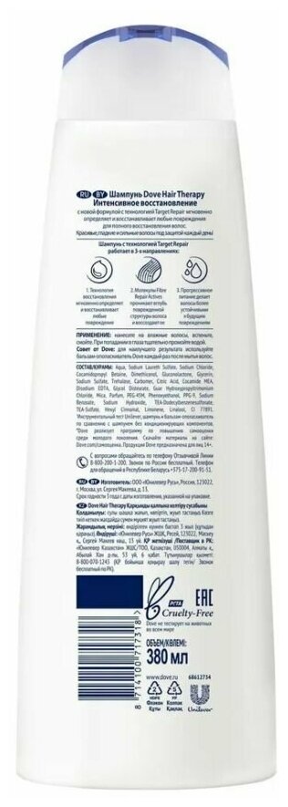 С каждым разом Ваши волосы выглядят все более сильными и красивыми! Интенсивно питает и восстанавливает поврежденные волосы. Заметно укрепляет и обеспечивает эффективное увлажнение. Технология Keratin Repair помогает восстановить поврежденную структуру волос изнутри. Волосы выглядят более здоровыми, сильными и красивыми. Подходит для ежедневного использования более здоровый внешний вид волос. Описание DOVE / Шампунь для поврежденных волос Интенсивное восстановление Хотите узнать, как восстановить поврежденные волосы? Мы знаем, что, несмотря на все наши усилия обеспечить им защиту, волосы со временем поддаются внешним негативным воздействиям, что приводит к повреждению их структуры. Подобрав правильное средство для ухода за поврежденными волосами, Вы можете сделать их более сильными и защитить от ломкости на длительное время. Состав: вода, глицерин, слюда, лимонная кислота, диметиконол, гидроксид натрия, бутилфенил метилпропиональ, линалоол, цитронеллол, феноксиэтанол, гексил циннамал, кокамидопропилбетаин, натрия бензоат, парфюм, натрия лауретсульфат, кремния диоксид, трегалоза, этиленгликоль дистеарат, глюконолактон, гуар гидроксипропилтримониум хлорид, натрия сульфат, краситель cl 77891, Натрий Хлорид, Kарбомер, этилендиаминтетрауксусной кислоты, лимонная Применение: С каждым разом Ваши волосы выглядят все более сильными и красивыми! Интенсивно питает и восстанавливает поврежденные волосы. Заметно укрепляет и обеспечивает эффективное увлажнение. Технология Keratin Repair помогает восстановить поврежденную структуру волос изнутри. Волосы выглядят более здоровыми, сильными и красивыми. Подходит для ежедневного использования более здоровый внешний вид волос. Меры предосторожности Уважаемые клиенты! Информация о технических характеристиках, комплекте поставки, стране изготовления и внешнем виде товара носит справочный характер и основывается на последних доступных сведениях от производителя