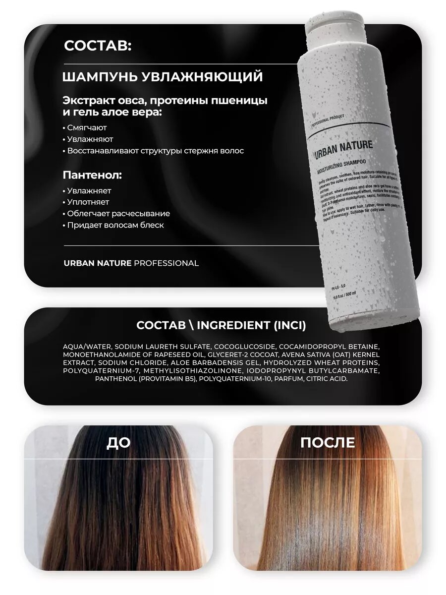 Шампунь для волос 500мл Супер Увлажнение от Urban Nature – это современное средство по уходу за волосами, разработанное для обеспечения интенсивного увлажнения, мягкой очистки и улучшения текстуры ваших волос. Этот шампунь объединяет натуральные ингредиенты и передовые технологии, чтобы придать вашим волосам здоровье, блеск и шелковистость. Продукт не содержит парабенов, силиконов и искусственных красителей. Предназначен только для наружного применения. Увлажняющий шампунь сохраняет цвет окрашенных волос, а также поддерживает результат процедур по восстановлению волос. Благодаря комплексу натуральных ингредиентов шампунь для волос женский сохраняет чистоту кожи головы долгое время. Подходит для ежедневного применения. Натуральный шампунь для окрашенных волос бережно очищает волосы от грязи, излишков жира и остатков стайлинг продуктов, не повреждая их структуру. Органический шампунь для чувствительной кожи головы против выпадения и от пушистости волос. Укрепляющий эко органик шампунь против перхоти очищает мужские жесткие волосы. Бессульфатный шампунь для ухода за чувствительной и склонной к сухости кожи головы, а также за пористой, сухой, вьющейся и ломкой структурой волос. Состав обогащён экстрактами и протеинами, комплексом витаминов, аминокислот и минеральных веществ, благодаря которым активно питает, восстанавливает, наполняет кожу головы и волосы влагой, делая их более мягкими и эластичными. Professional shampoo Профессиональная косметика для ухода за волосами дома. Благодаря натуральному составу подойдет подросткам, девочкам и мальчикам. Откройте для себя прекрасный мир увлажненных, здоровых и блестящих волос с шампунем Супер Увлажнение от Urban Nature. Подарите своим волосам заботу и роскошный уход!