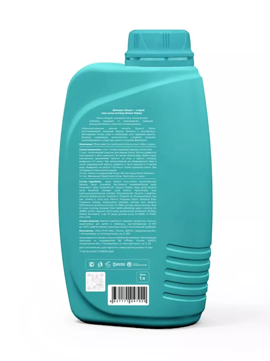 Увлажняющий шампунь для объема Groom VOLUME – второй этап мытья системы Groom Galaxy. Мягко очищает, увлажняя кожу. Коллагеновый комплекс защищает от повреждений, придавая роскошный объем и упругость каждому волосу. Полиненасыщенные жирные кислоты Glyceryl Oleate восстанавливают липидный барьер, витамины Е и F способствуют регенерации клеток кожи, стимулируют рост здоровой шерсти. Высокое содержание аминокислоты L-Arginine улучшает кровообращение и структуру шерсти на уровне фолликула. Прошел клинические испытания. Преимущества: 1. Здоровая кожа. 2. Роскошный объем и упругость шерсти. 3. Глубинное восстановление текстуры шерсти. 4. Моментальная сушка. 5. Шерсть упругая, шелковистая, держит форму. 6. Высокая концентрация активных веществ. Результат: Роскошный объем. Поддержание защитного барьера кожи.