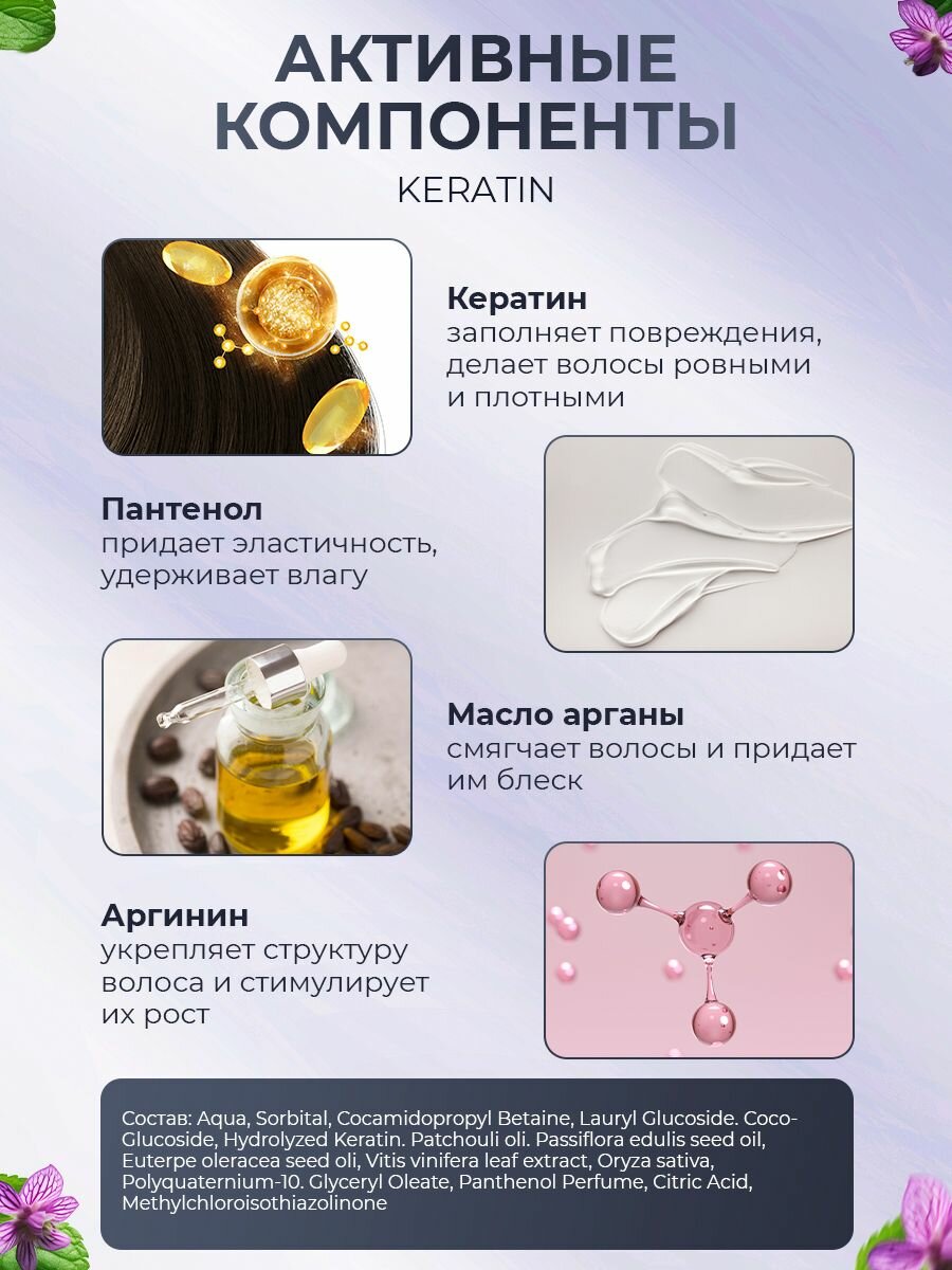 | Состав | Шампунь: Aqua, Cocamidopropyl Betaine, Lauryl Glucoside, Coco-Glucoside, Vitis Vinifera Seed Extract, Hydrolyzed Keratin, Glyceryl Oleate, Panthenol, Parfum, Citric acid, Methylchloroisothiazolinone. Кондиционер : Aqua (water), Cetearyl Alcohol Steartrimonium Chloride, Hydrolyzed Keratin, Vitis Vinifera Seed Extract, Dimethicone, Hydroxyethylcellulose, Parfum, Citric Acid, Methylchloroisothiazolinone and Methylisothiazolinone, C.l17200, C.1.42090. |