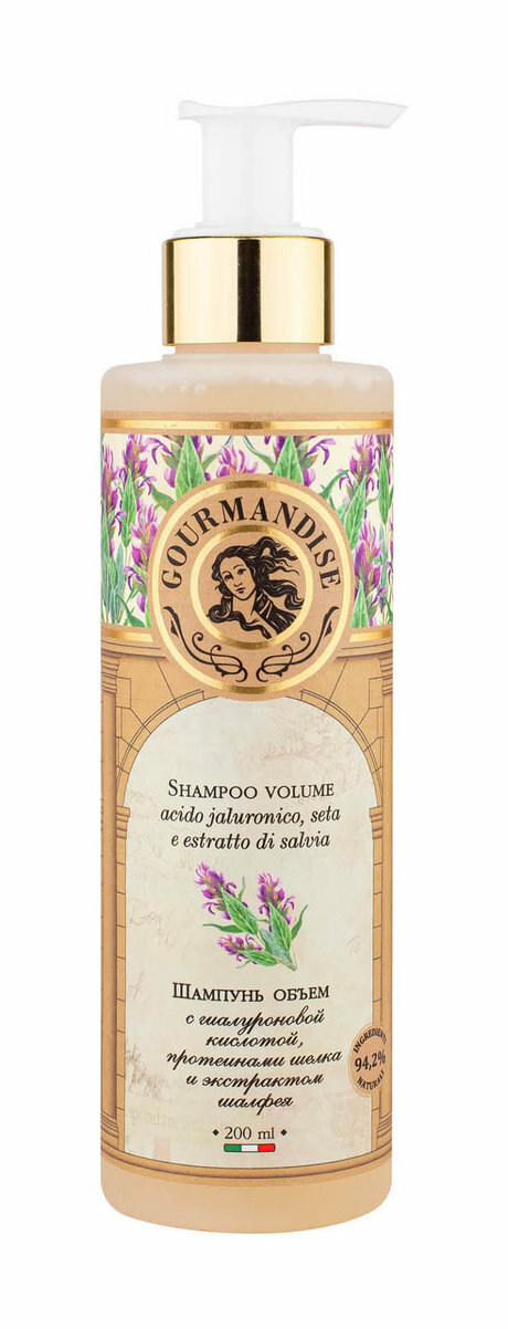 Шампунь с гиалуроновой кислотой, протеинами шелка и экстрактом шалфея Gourmandise Shampoo Volume Acido Jaluronico, Seta e Estratto di Salvia: сравнение цен, характеристики, фото, актуальное наличие и цены.