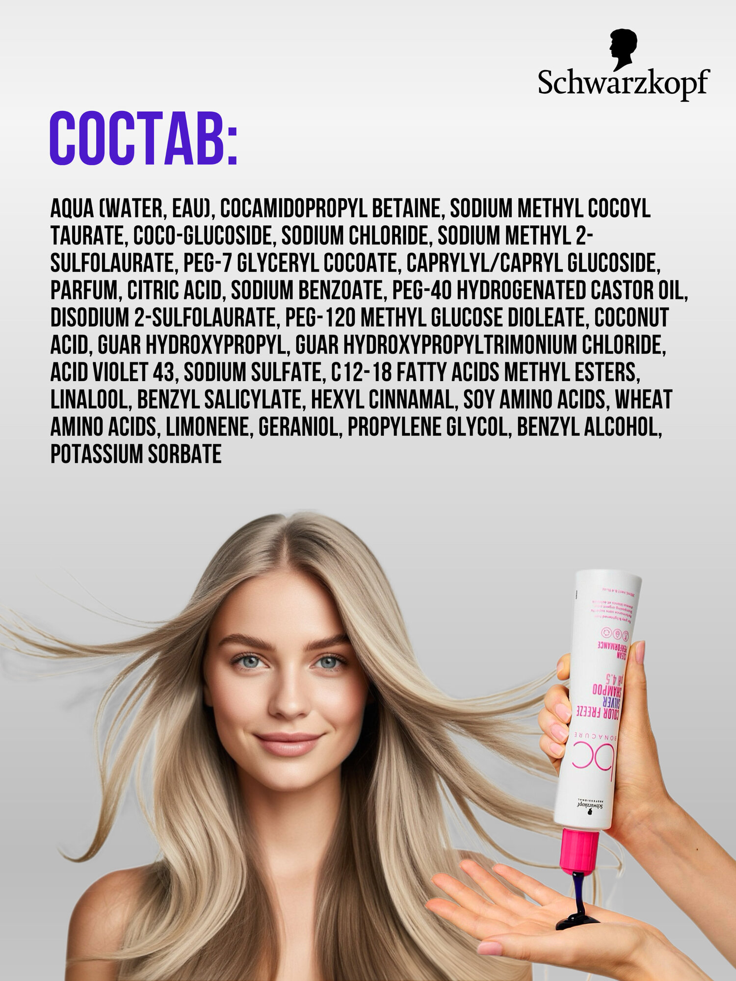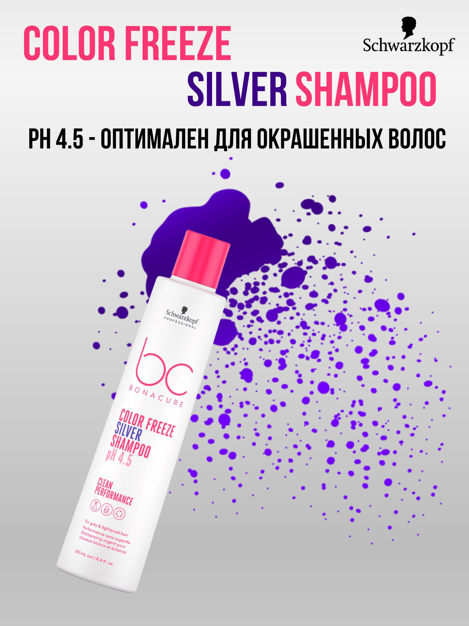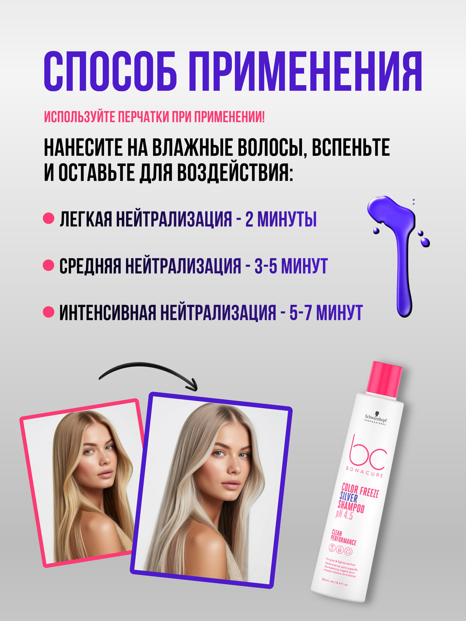 В процессе мытья головы специальные сине-фиолетовые пигменты обволакивают поверхность волоса, освежая или усиливая холодное направление тона. Ухаживающие ингредиенты помогают улучшить качество волос.