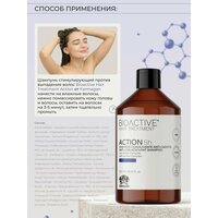 Нанесите небольшое количество шампуня на волосы, оставьте на 5 минут, затем тщательно смойте. Для достижения желаемого эффекта используйте вместе с ампулами и укрепляющим маслом ACTION.