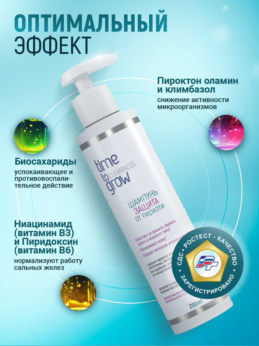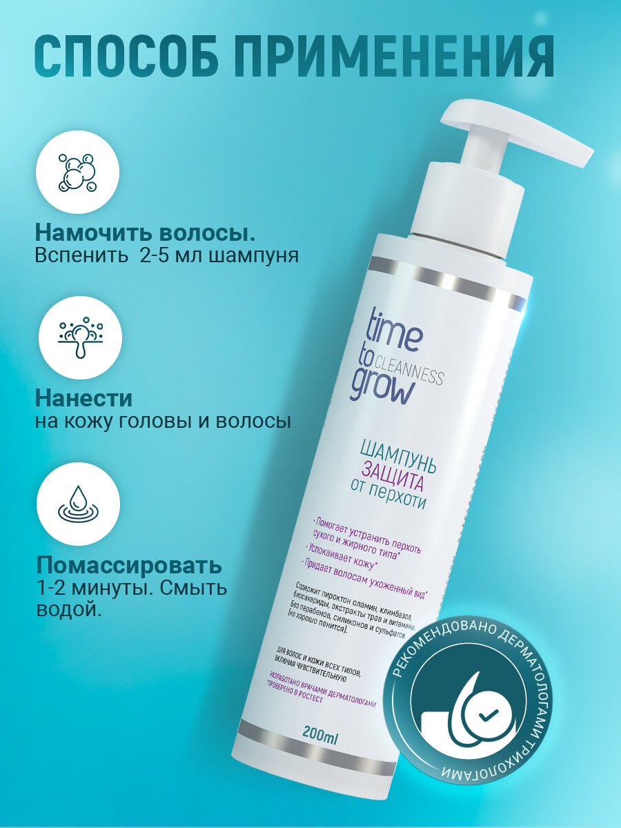 | Способ применения | Рекомендуется использовать через день (при необходимости - ежедневно) в течение двух месяцев. На третий месяц, по необходимости – 2-3 раза в неделю. При необходимости ежедневного мытья и чувствительной коже высокоэффективно чередование через день с Восстанавливающим шампунем с биоидентичными церамидами. Кожа головы и волосы: Вспенить 2-5 мл шампуня (в зависимости от длины волос), нанести на кожу головы и волосы, помассировать 1-2 минуты. Смыть теплой водой. Нанести повторно, оставить на 5 минут, смыть большим количеством воды. Для повышения эффективности при выраженном шелушении и длительном развитии проблемы рекомендуется использовать 1-2 раза в неделю Маску-прешампунь "Глубокое очищение" перед мытьем головы. Маска имеет фунгицидное и бактерицидное действие, способствует более тщательному отшелушиванию ороговевших чешуек, снижает жирность кожи. При раздраженной или сухой коже головы и волосах после шампуня также рекомендуется использовать Восстанавливающую маску для волос и кожи головы. Маска позволит снять ощущение сухости, стянутости и зуда, продлит и усилит действие активных компонентов шампуня, направленных на устранение причин перхоти, поддержит местный иммунитет и улучшит качество волос. После окончания курса применения Шампуня-Защита от перхоти рекомендуем перейти на использование одного из шампуней Time to grow для регулярного применения, в зависимости от типа вашей кожи или по рекомендации специалиста. Кожа лица и тела: Вспенить 1-4 мл (в зависимости от площади нанесения) и нанести на кожу лица и/или тела. Смыть теплой водой. При наличии описанных негативных проявлений на коже лица и тела рекомендуем обратиться к врачу, так как возможно потребуется дополнительно к очищению лекарственная терапия. |