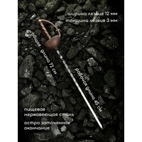 Толщина лезвия – 3мм ⠀ Длина лезвия (рабочая длина) – 450мм (45см)⠀ Общая длина шампура – 72см Ширина лезвия – 12мм (1,2см)