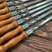 Лезвия шампуров выполнены из металла и имеют плоский тип, что гарантирует равномерное и быстрое приготовление пищи. Деревянные ручки покрыты несколькими слоями качественного, огнестойкого лака, что делает их удобными и безопасными в использовании.
