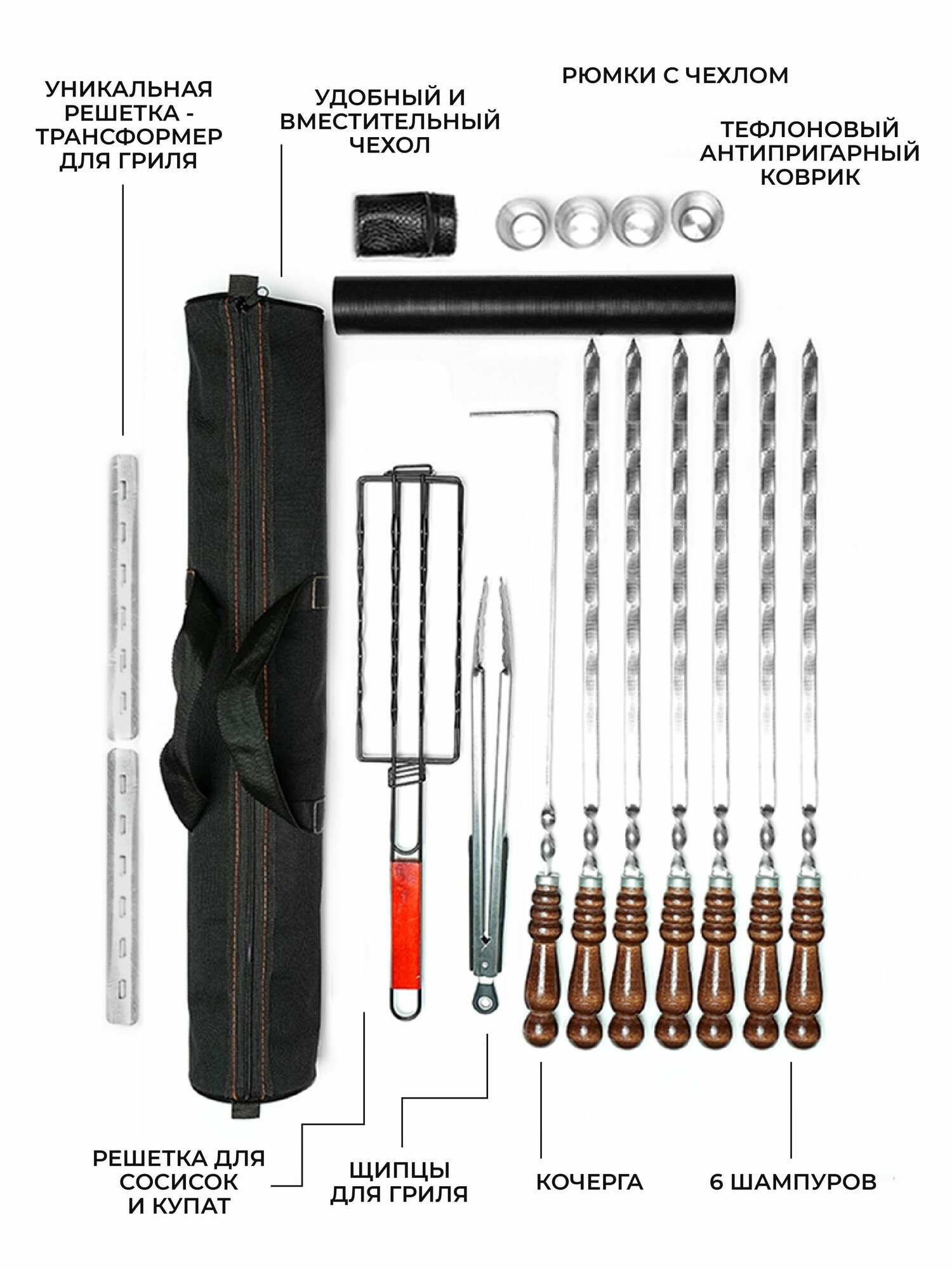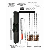 Чехол из плотной водоотталкивающей ткани; Опахало для углей; Кочерга для углей; Двойной шампур; Шампур-спица; 6 шампуров с деревянной ручкой; Нож 6 в 1;