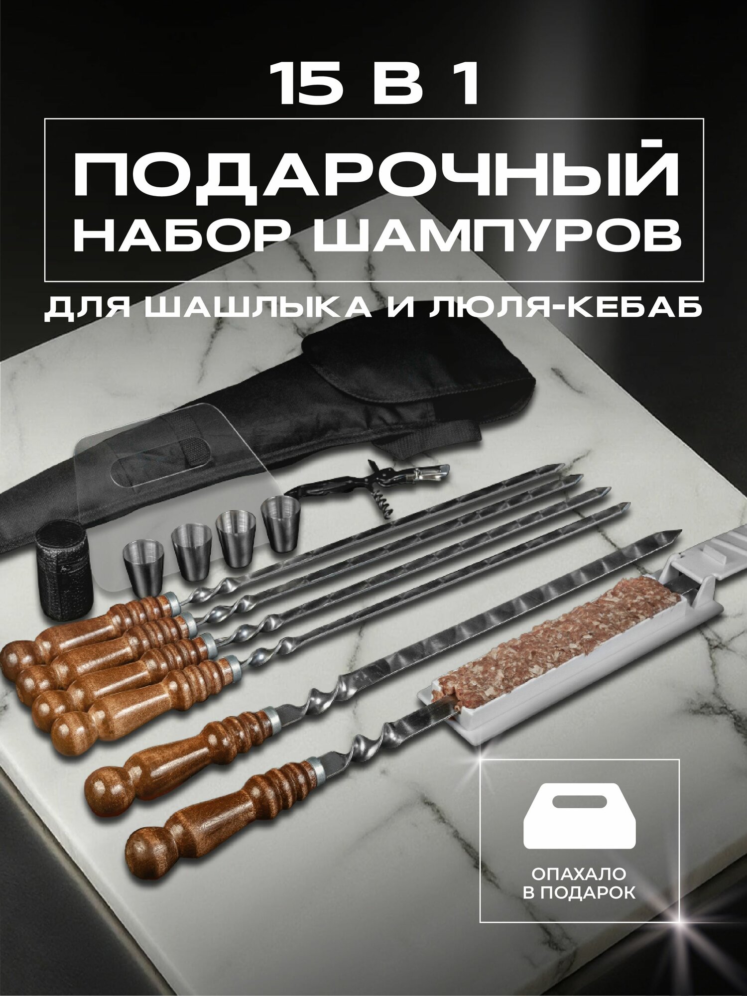 Подарочный набор шампуров для станет идеальным подарком для любителей шашлыка, гриля и барбекю. В его состав входят: шампуры с деревянной ручкой из нержавеющей стали - 4 шт, шампура для люля кебаб – 2 шт; пресс форма; рюмки - 4 шт. Все шампура из нержавейки и производство – Россия, длина лезвия – 40 см. Все это аккуратно упаковано во вместительный и удобный чехол. Мужской шашлычный набор шампуров с деревянными ручками отлично подойдет в подарок на день рождения и юбилей - папе, мужу, любимому, гораздо практичней любого кейса. Не упустите возможность порадовать своих близких! Этот мангальный аксессуар станет незаменимым помощником в приготовлении вкусных блюд из мяса, курицы, рыбы и овощей.
