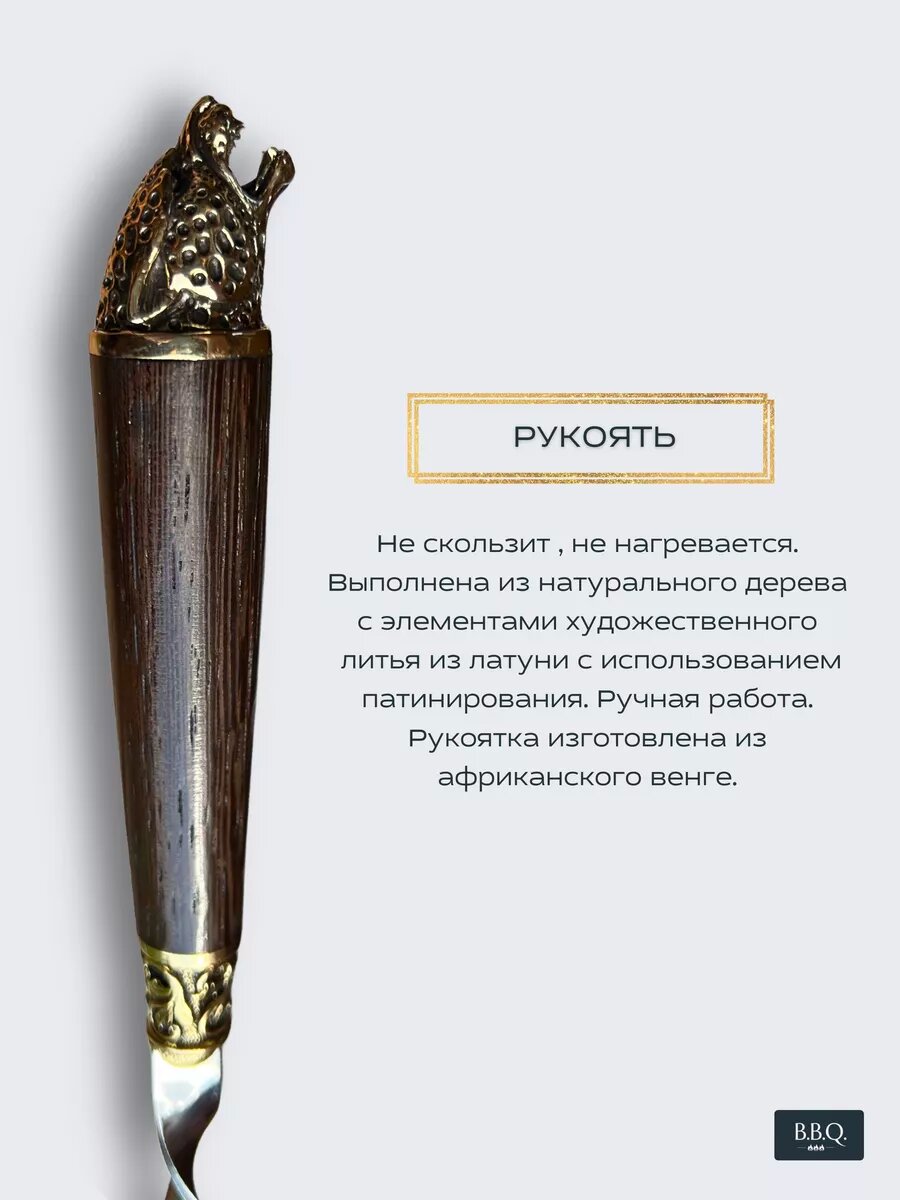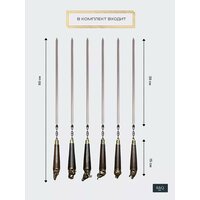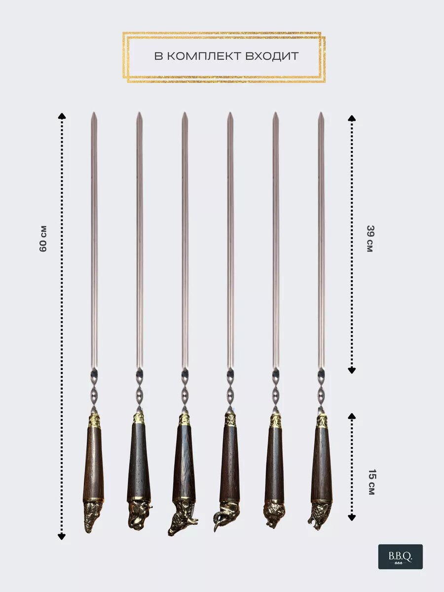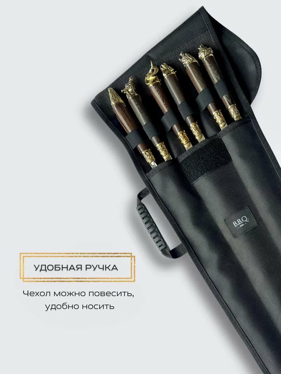 Шампура от производителя в РФ. Наше преимущество - качественное исполнение. Надежное крепление. Экологически чистая пищевая нержавеющая сталь. Острое ровное острие. Практичный удобный чехол. Отдых на природе - это прекрасный способ расслабиться и отдохнуть, забыв о домашних делах и заботах. Всем любителям хорошего отдыха понравится этот набор из разнообразных шампуров от компании B.B.Q. Набор шампуров с деревянной ручкой - это отличный подарок для любого мужчины. В комплект входят 6 предметов и чехол. Все составляющие шашлычного набора находятся в практичном чехле из водоотталкивающей износостойкой ткани. Шампуры производятся из 100% нержавеющей пищевой стали марки AISI 430, устойчивой к нагреванию. Набор подойдет для приготовления на мангале барбекю стейка, сосисок, люля - кебаб и др вида мяса и морепродуктов. Этот набор шампуров для шашлыка можно подарить на годовщину свадьбы , день рождения, юбилей начальнику руководителю.
