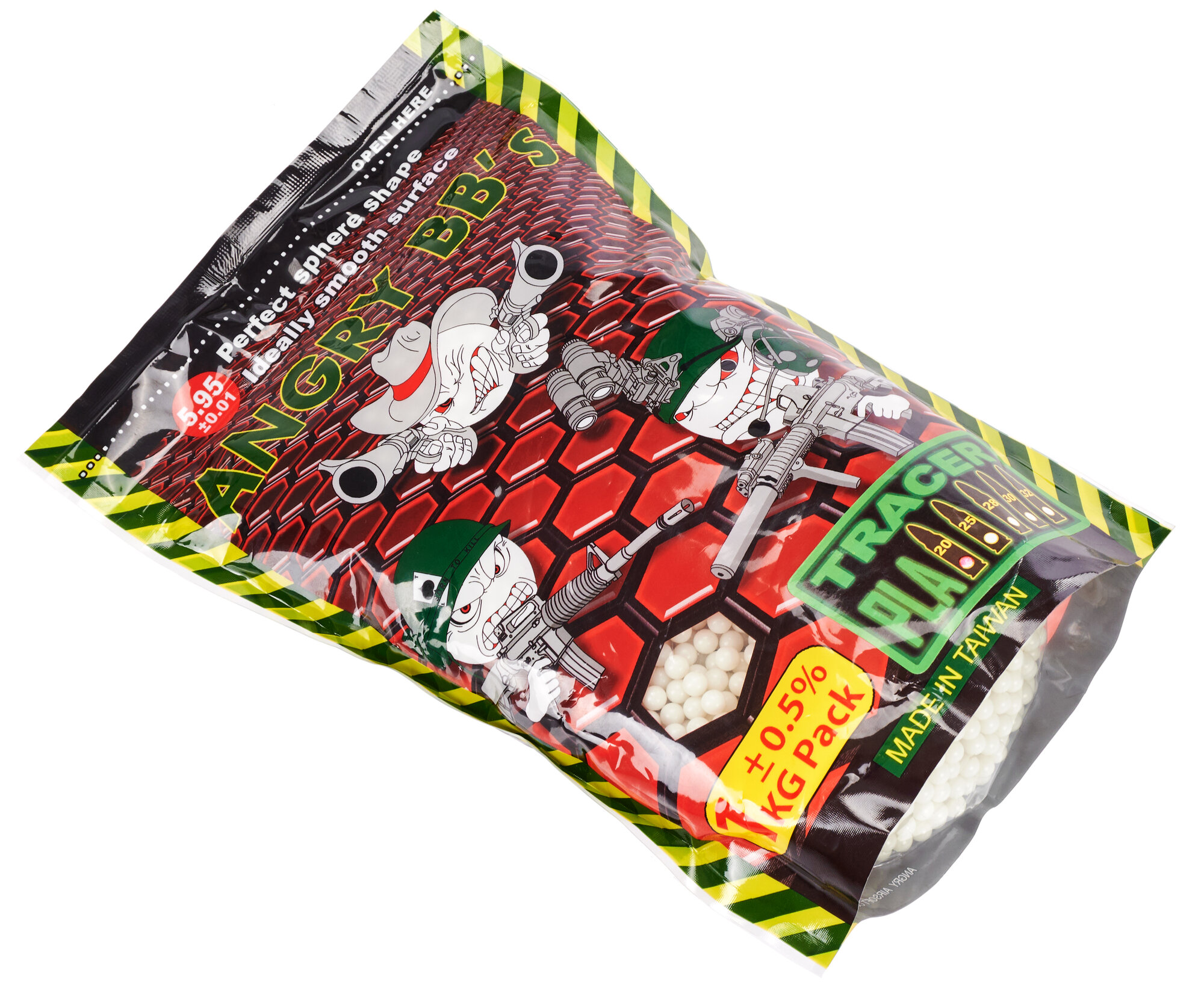 Страйкбольные шарики Angry BBs выпускаются в пакете из полиэтилена, который вмещает до 5000 снарядов. Пули изготавливаются из высококачественного пластика и проходят шлифовку для достижения идеальной сферической формы. За счет гладкой обтекаемой поверхности шарики характеризуются неплохой аэродинамикой, что вкупе с подкруткой в Хоп Ап механизме позволяет увеличить дистанцию стрельбы.