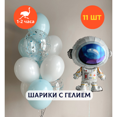В комплекте вы найдете фольгированный шар в форме космонавта и 10 воздушных шаров.