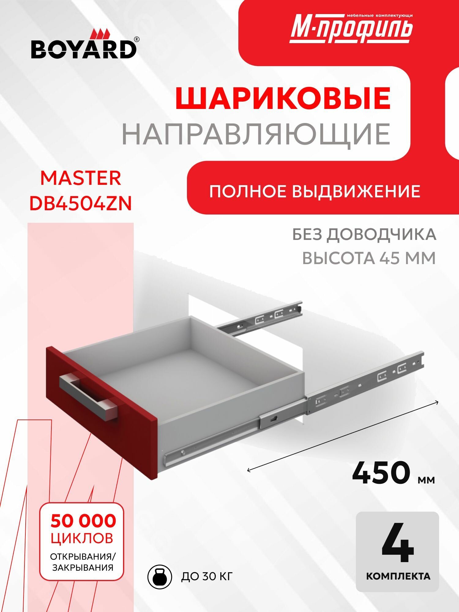 Шариковые направляющие для ящиков 450 мм телескопические полного выдвижения Boyard Master DB4504Zn/450 4 комплекта, высота 45 мм: сравнение цен, характеристики, фото, актуальное наличие и цены.