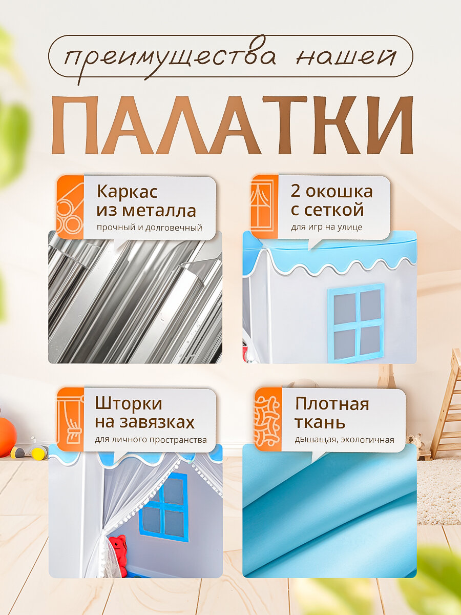 Предлагаем вам подарить вашему ребёнку не просто игрушку, а мир, полный приключений и волшебства, где каждый день обещает новые и увлекательные истории. Детская игровая палатка голубой домик для детей – это выбор, который принесёт радость и уют, создав незабываемые моменты детства!