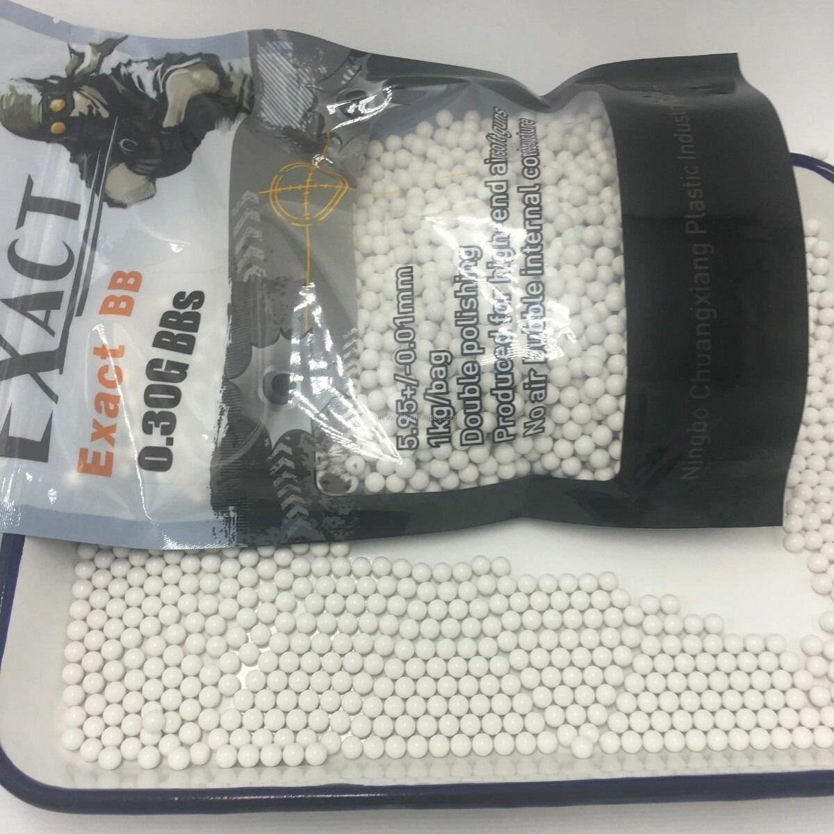 Шары BB Exact 0,30g, 3334 шт. — 1 кг, белые. Калибр — 6 мм, вес — 0,30 г, в упаковке 1 кг шаров (около 3334 шт.). Диаметр шара — 5,95 +/-0,01 мм.
