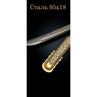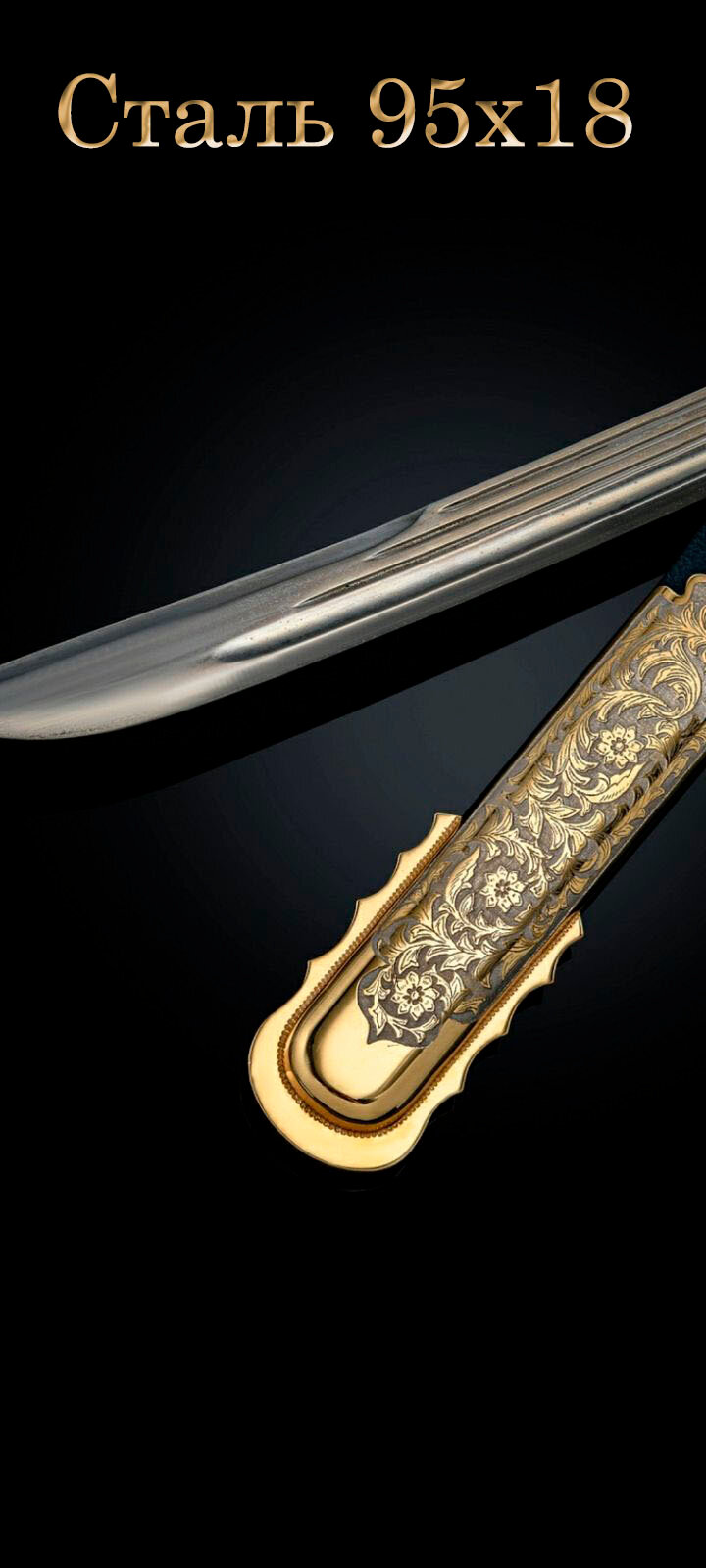 Кованная казачья шашка была принята на вооружение в конце 18 века. Наградной вариант казачьей шашки использовался для поощрения военнослужащих офицерских чинов царской армии. Сталь клинка : 95Х18. Сталь изготавливается и куется строго по технологии. На клинке методом химического травления, вручную нанесен традиционный растительный узор. Лезвие: Подведено под заточку Крепление рукояти : Боевое (цельное) Ножны: выполнены из массива сосны для большей устойчивости к деформации, обтянуты качественной натуральной кожей и прошиты. Латунный прибор ножен состоит из устья, обоймицы и наконечника. Темляк: изготовлен методом плетения мастерами из натуральной кожи. Использованы техники обработки металла - травление, гравировка, золочение. Содержание драгоценных металлов: золото 999.9. длина общая в ножнах -104 см, общая - 991 мм клинка- 800 мм ширина лезвия по обуху 30мм толщина металла 6 мм Рукоять -190 мм Твердость по Роквеллу 39 HRC В комплекте- тканевый чехол, сертификат, каталог компании "Люксовв" Примечание : Товар сертифицирован Место изготовления- г. Омск, Россия.