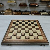 Размер доски 45 на 45 см в разложенном виде. Размер клетки 3 см. Доска сделана в технике маркетри из ореха и ясеня. Ручная работа. Фишки с подклейкой. В комплекте 30 шашек.