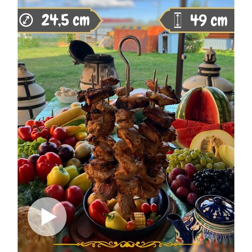 Хотите наслаждаться исключительно вкусом и ароматом ваших блюд, и при этом избегать пригорания? Шашлычница с чугунной сковородой поможет Вам! Основным преимуществом этого приспособления является наличие чугунной сковороды, которая сохраняет весь сок от мясных продуктов, нанизанных на шампуры. Можно нанизывать абсолютно разные куски мяса и даже рёбра или стейки! Шашлычницу можно подвесить за перекладину или разместить прямо на дне тандыра на углях. Во время приготовления сок с мяса капает на овощи, придавая им богатый вкусный аромат. Благодаря долгому сохранению жара чугунной сковородой, гарнир будет долго поддерживать свою температуру и оставаться горячим.