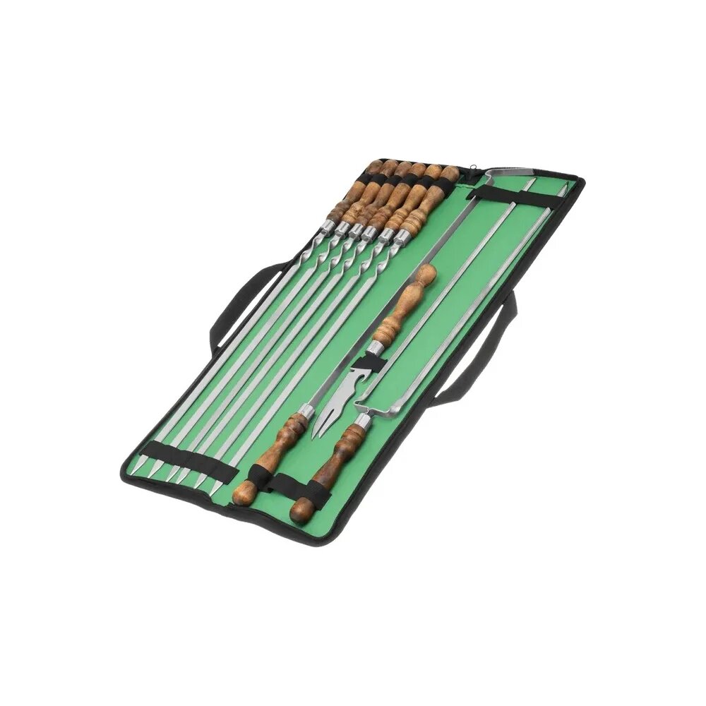 - Прочность и долговечность — элементы набора изготовлены из нержавеющей стали, шампуры увеличенной толщины 2,5 мм не сгибаются и не деформируются под тяжестью продуктов.