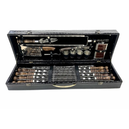 Высококачественный шашлычный набор с шампурами в деревянном чемодане. Идеален для подарка мужчине на 23 февраля, день рождения, юбилей, новый год или любой другой праздник. Состав: Деревянный чемодан, профессиональные шампура (8 шт); топорик; нож (сталь нержавеющая 65х13); многофункциональный нож для снятия мяса и не только; большой шампур для курицы/овощей и подобного; набор металлических стопок 4 шт; вилка; складной мангал; фляжка. Деревянная ручка шампура выполнена из бука и покрыта качественной морилкой и лаком. Такие шампуры приятно держать в руке и прослужат долгое время. Производство заводское. г.Кизляр