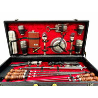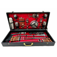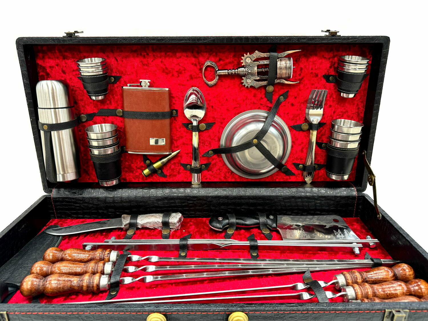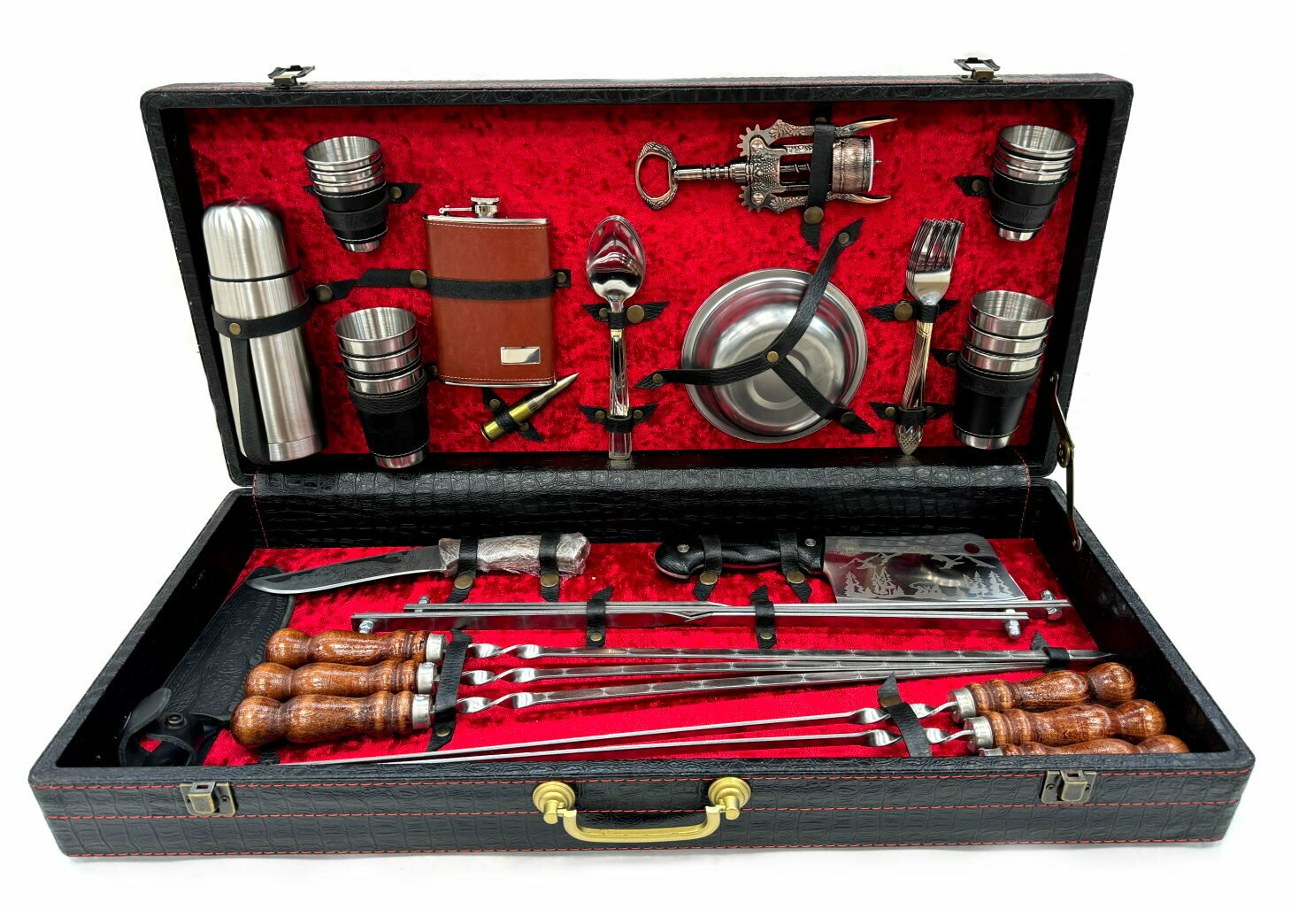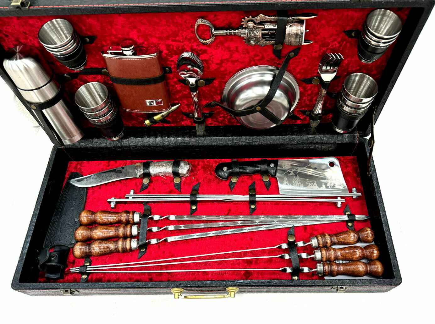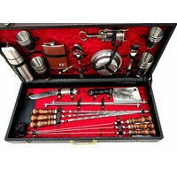 Высококачественный шашлычный набор с шампурами в деревянном чемодане. Идеален для подарка мужчине на 23 февраля, день рождения, юбилей, новый год или любой другой праздник. Состав: Деревянный чемодан, профессиональные шампура (6 шт), нож (сталь нержавеющая 65х13), топорик (сталь нержавеющая 65х13); складной мангал; набор металлических стопок маленьких 6 шт, набор металлических стопок больших 6 шт, металлические тарелки, штопор-открывалка, фляжка, термос, ложка вилка, пуля-зажигалка Деревянная ручка шампура выполнена из бука и покрыта качественной морилкой и лаком. Такие шампуры приятно держать в руке и прослужат долгое время. Производство заводское. ИП Поддубный г.Кизляр
