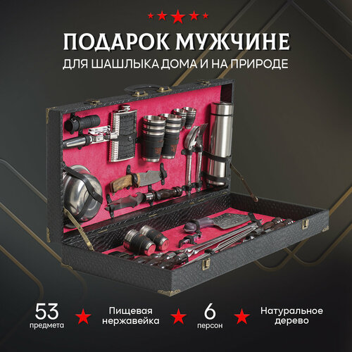 Шашлычный набор - отличный подарок для мужчин на любой праздник в году. Новый мужской комплект для шашлыка может стать как новогодним подарком для вашего мужчины, так и презентом на 23 февраля, или день рождения. В подарочном туристическом наборе есть всё необходимое для пикника: 6 полноразмерных шампуров с деревянной ручкой, набор посуды (вилки, ложки и тарелки из нержавейки) на 6 персон, складной походный мангал, нож-вилка для снятия мяса и разделочный нож Кизляр (подойдёт и для использования на кухне), разделочный топор, термос и фонарик (позволят использовать набор не только днём), стопки 100 мл и 50 мл. (по 6 шт. каждого вида), стаканы для горячего, фляжка из нержавеющей стали, точилка для ножа, открывалка-штопор, зажигалка. Данный набор предметов можно использовать для приготовления шашлыка, а также для барбекю и жарки мяса на гриле. Весь инвентарь высокого качества и располагается в удобном походном кейсе из дерева, обтянутого черной эко-кожей снаружи и красным велюром внутри.