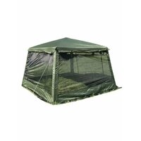 Модель этой палатки-шатра создана для двух направлений и ее конструкция позволит не только комфортно переночевать или отдохнуть на природе, но и расположить внутри палатки небольшую походную кухню или туристический стол со стульями. Туристическая палатка-шатер имеет классическую форму, четырехскатную коническую крышу и весьма хорошую высоту - 245 см, из-за чего даже самым высоким людям не придется нагибаться внутри палатки. Боковые стенки имеют москитные сетки, которые защищают от насекомых и хорошо пропускают солнечный свет. При наступлении ночи боковые стенки закрываются шторками.
