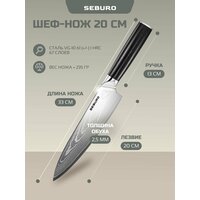 Шеф-нож длиной 20 см - это оптимальный размер для большинства кухонных работ. Он имеет достаточно длинное лезвие для того, чтобы легко нарезать большие куски мяса или рыбы, а также достаточно короткое для того, чтобы быть удобным в использовании. Лезвие ножа позволит точно нарезать ломтики и небольшие кусочки салями, сыра или мяса на бутерброды. Вы можете нарезать ломтиками свежую или соленую рыбу для приготовления суши и сашими. Можно даже нарезать тонкие ломтики от крупных кусков пищи.