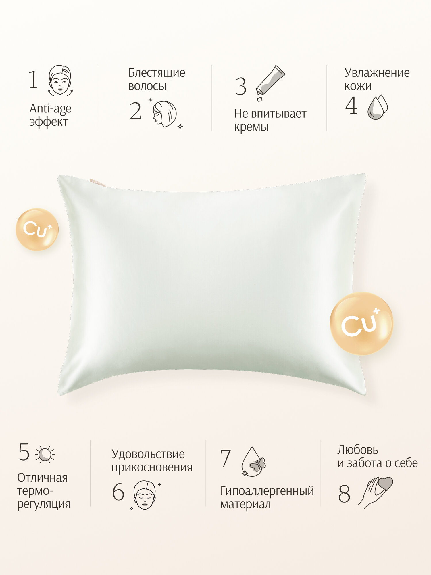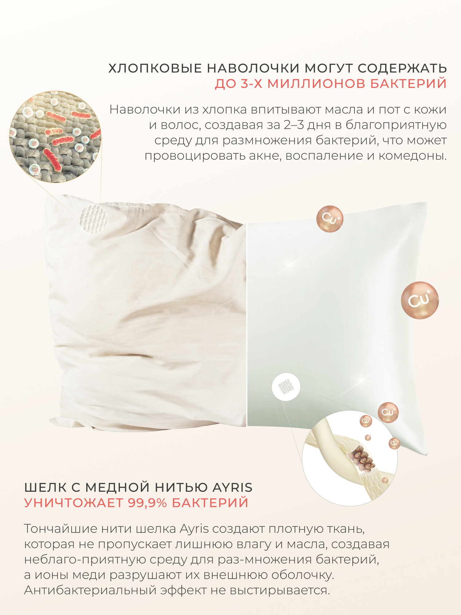 Первая бьюти-наволочка с двойным эффектом: фирменный шелк Ayris Silk ухаживает за кожей и волосами + медная нить в составе полотна обеспечивает активную защиту от бактерий.