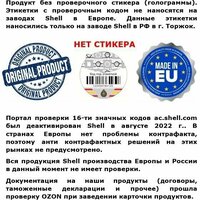| Дополнительная информация | Компания SHELL в мае 2022 года продала весь свой бизнес компании Лукойл. Начиная с указанной даты SHELL перестал поддерживать систему проверки подлинности. Этот факт подтверждается если перейти на сайт проверки, указанный на проверочной этикетке - http://ac.shell.com/index.aspx |