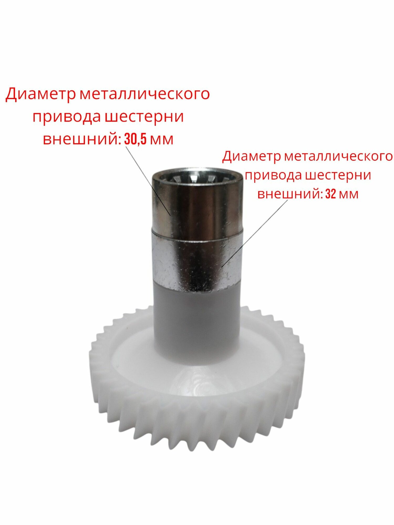 Характеристики шестерни: Диаметр зубьев шестерни внешний: 82 мм Диаметр металлического привода шестерни внешний: 30,5 мм / 32 мм Диаметры отверстия шестерни внутреннее под зубья привода: 25 мм / 22 мм Диаметр под шток вала: 7 мм Высота шестерни: 80,5 мм Количество зубьев больших: 38 шт Тип больших зубьев: косые Высота зубьев больших: 17 мм Количество зубьев под привод: 12 шт Производство: Redmond