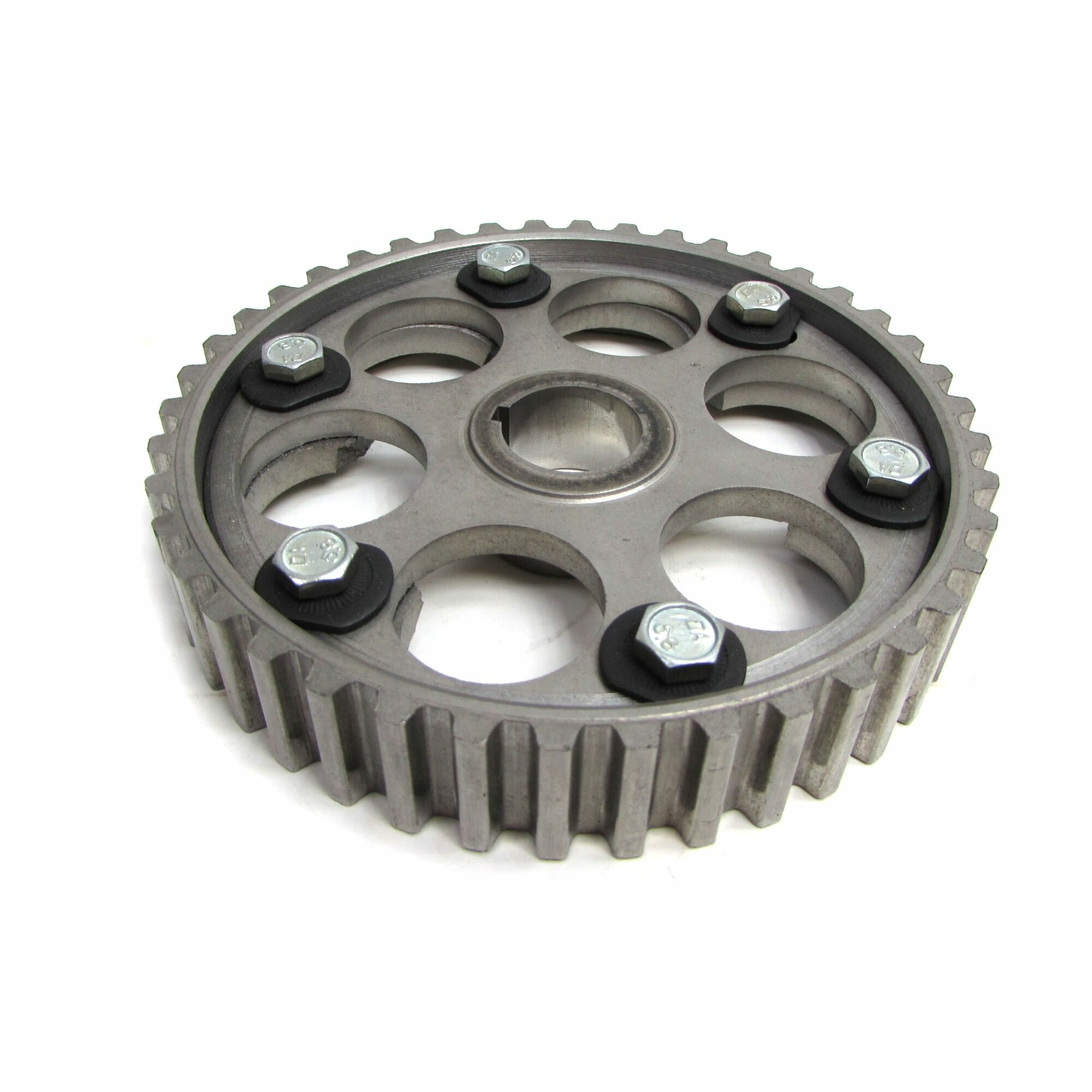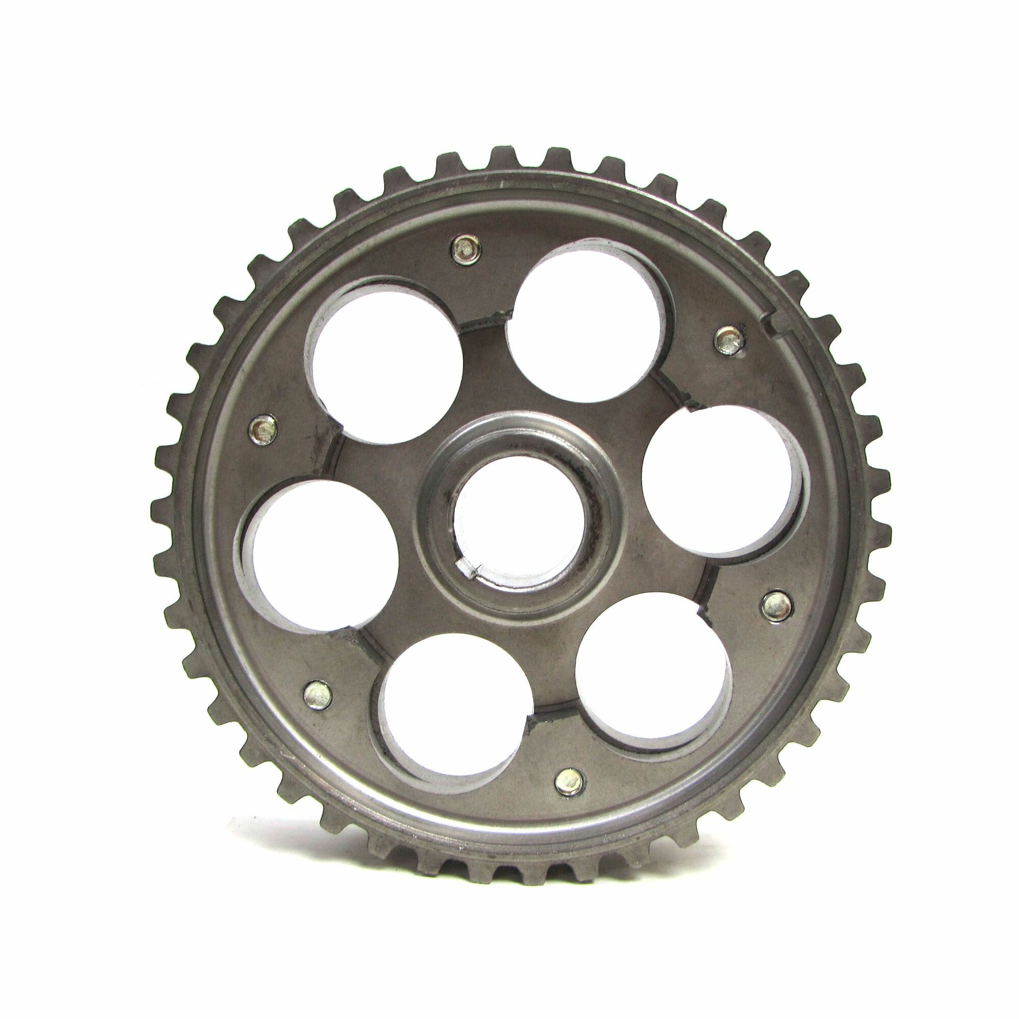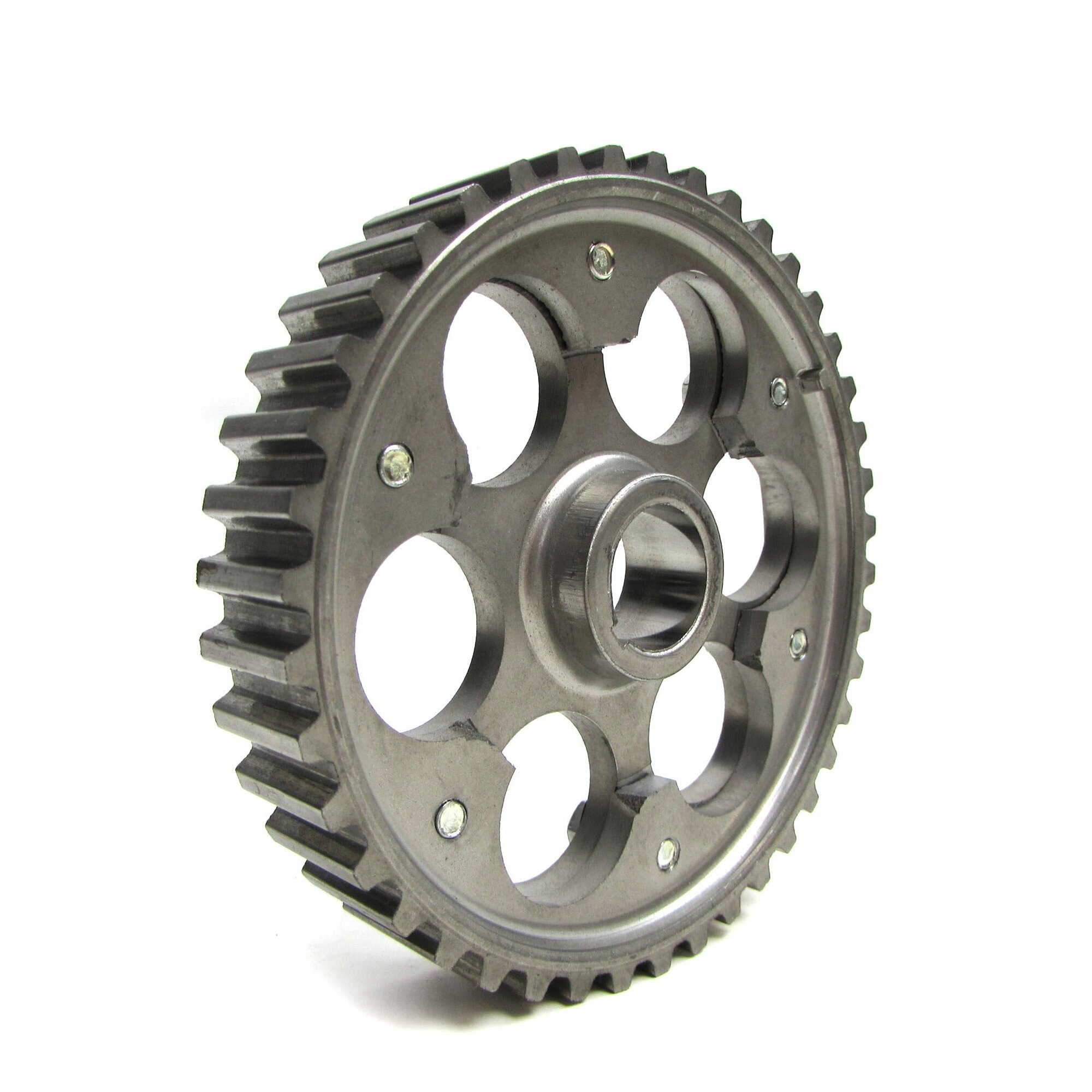 Разрезная шестерня изготавливается из двух заводских стандартных шестерней распредвала. Необходима при установке тюнингового распределительного вала. Разрезная шестерня дает возможность менять положение зубчатой части, оставляя центр неподвижным, что означает сдвиг в 0 коленвала. Таким образом, двигатель, оснащенный обычной шестерней, существенно теряет в мощности и крутящем моменте относительно максимальных теоретически возможных.