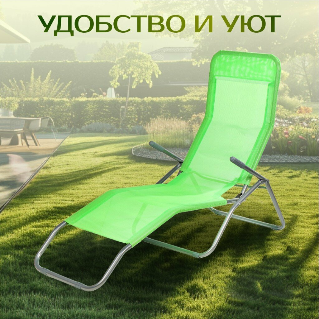 Складная конструкция делает это туристическое кресло легким в транспортировке и хранении. Оно компактно складывается, что особенно удобно при использовании на природе или в походах. Анатомическая форма сиденья обеспечивает прекрасную поддержку спины и ног, а подлокотники облегчат процесс вставания. Сиденье сделано из сетчатого материала устойчивого к ультрафиолетовому излучению и образованию плесени, а также не впитывает влагу, пропускает воздух и быстро просыхает. Зеленый шезлонг поставляется в собранном виде, не требует дополнительной сборки. Размер: 147х58х38 см.