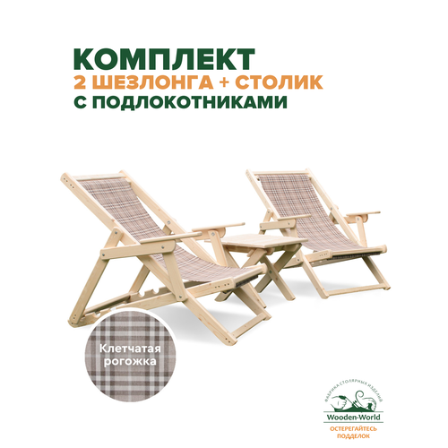 Купить Шезлонги для дачи складные деревянные с подлокотниками со столиком комплект, ткань в клетку с доставкой по всей России.