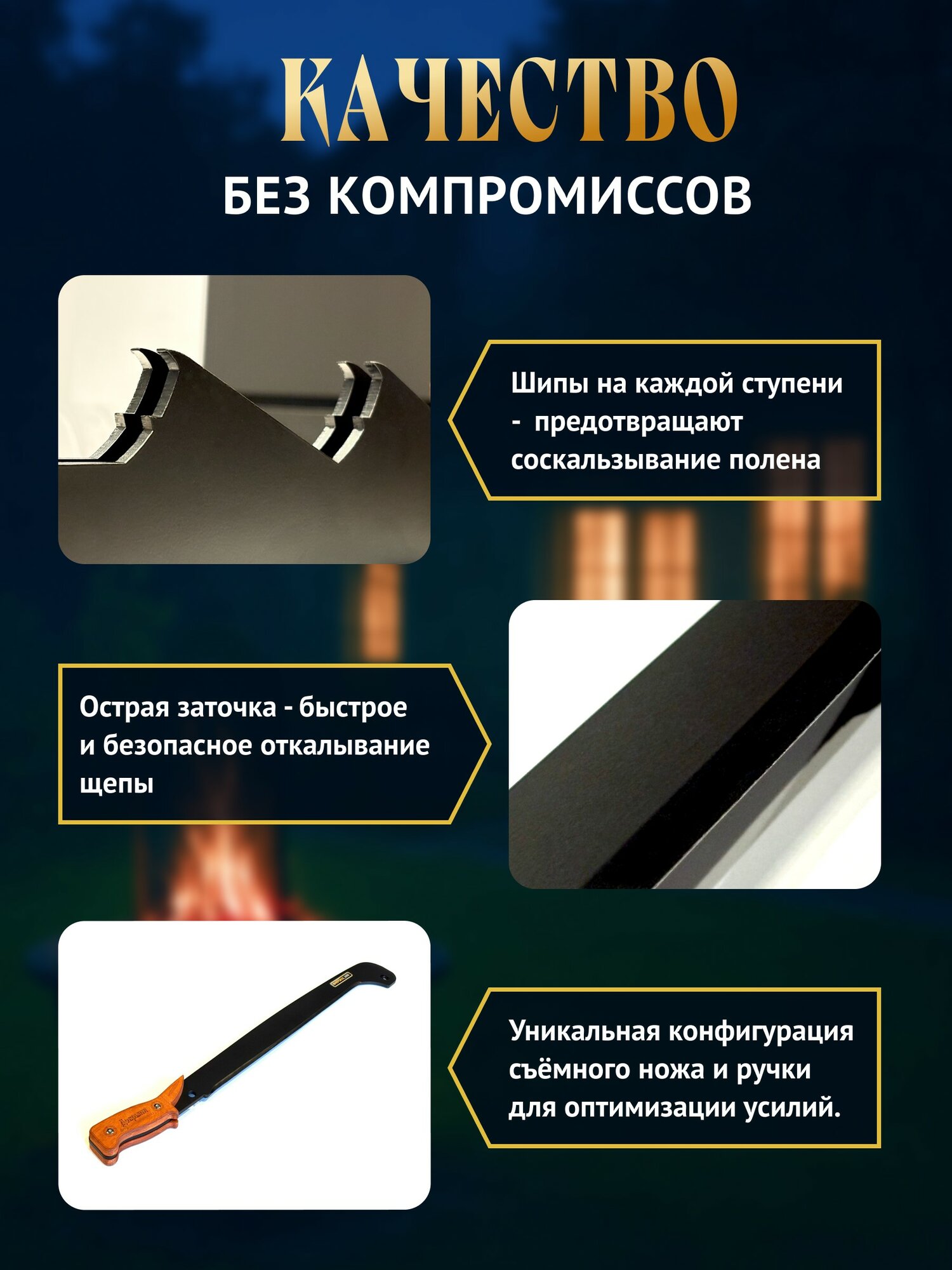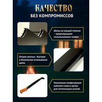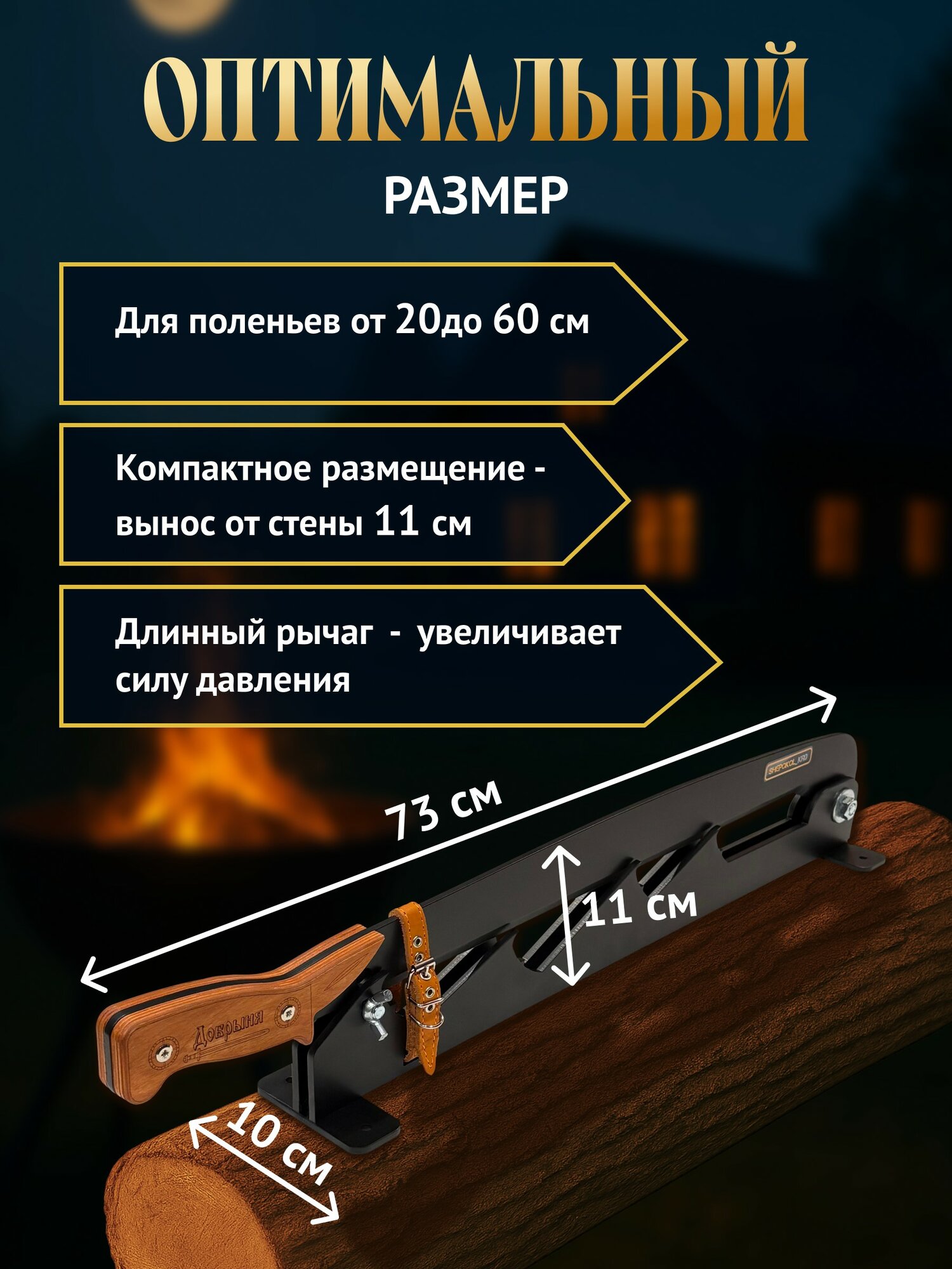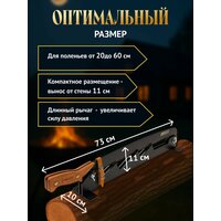 Щепокол нового поколения "Добрыня 2" ! Мы одними из первых в России наладили собственное производство щепоколов в 2018 году и щепокол "Добрыня" является нашим флагманом (более двух тысяч довольных покупателей этому подтверждение). "Добрыня 2" это усовершенствованная улучшенная модель щепокола "Добрыня". Мы учли все отзывы и пожелания наших клиентов, а также негативные отзывы у наших конкурентов. Видоизменили форму ножа, добавлена дополнительная четвёртая ступень, на каждой ступени появились зубцы чтобы полено не соскальзывало, сделано отверстие для закрепления ножа болтом помимо ремешка, поменяли и улучшили угол заточки ножа. Изменилась эргономика ручки, она теперь изогнута, удобно лежит в руке и есть упор для ладони. Также есть визуальные изменения в форме металла, ручка в виде клинка, добавлена гравировка с названием модели. Он надёжный (нож не погнётся, инструментальная сталь толщиной 5 мм), он компактно крепится к стене(вылет всего 12 см в сложенном виде), он мощный (учитывая рычаг в 73 см), он эффективный(четыре упора для поленьев от 20 до 60 см длиной и острый нож), он стильный, красивый и ОН работает! Щепокол "Добрыня 2" изготавливается в черном матовом цвете. С помощью рычага нож увеличивает силу давления во много раз - нужно прикладывать меньше усилий для нарезания щепы. Основным преимуществом нашего щепокола является длина рычага. Нож у щепокола "Добрыня" съёмный, длиной 73 см. Это прекрасный подарок мужчине, директору, руководству или на годовщину. Отличное приобретение и подарок в дом, на дачу, для бани, камина или зоны барбекю. Изготовлено изделие из прочной углеродистой стали, с профессиональной порошковой камерной окраской и рукояткой с гравировкой. Для закрепления ножа, когда он не используется, а также для защиты от маленьких детей, предусмотрен надёжный болт с вертушком, а также кожаный ремешок. Крепится щепокол с помощью 4-ёх саморезов, которые закрываются заглушками, всё входит в комплект поставки.