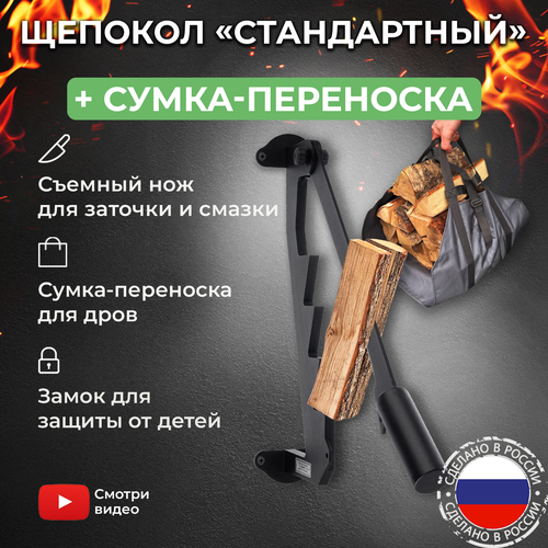 Удобный подарочный набор инструментов KOLUNDROV для заготовки щепы и розжига огня дома и на даче, в составе которого 2 предмета: щепокол-рычаг «Стандартный» и сумка-переноска для щепы и дров.