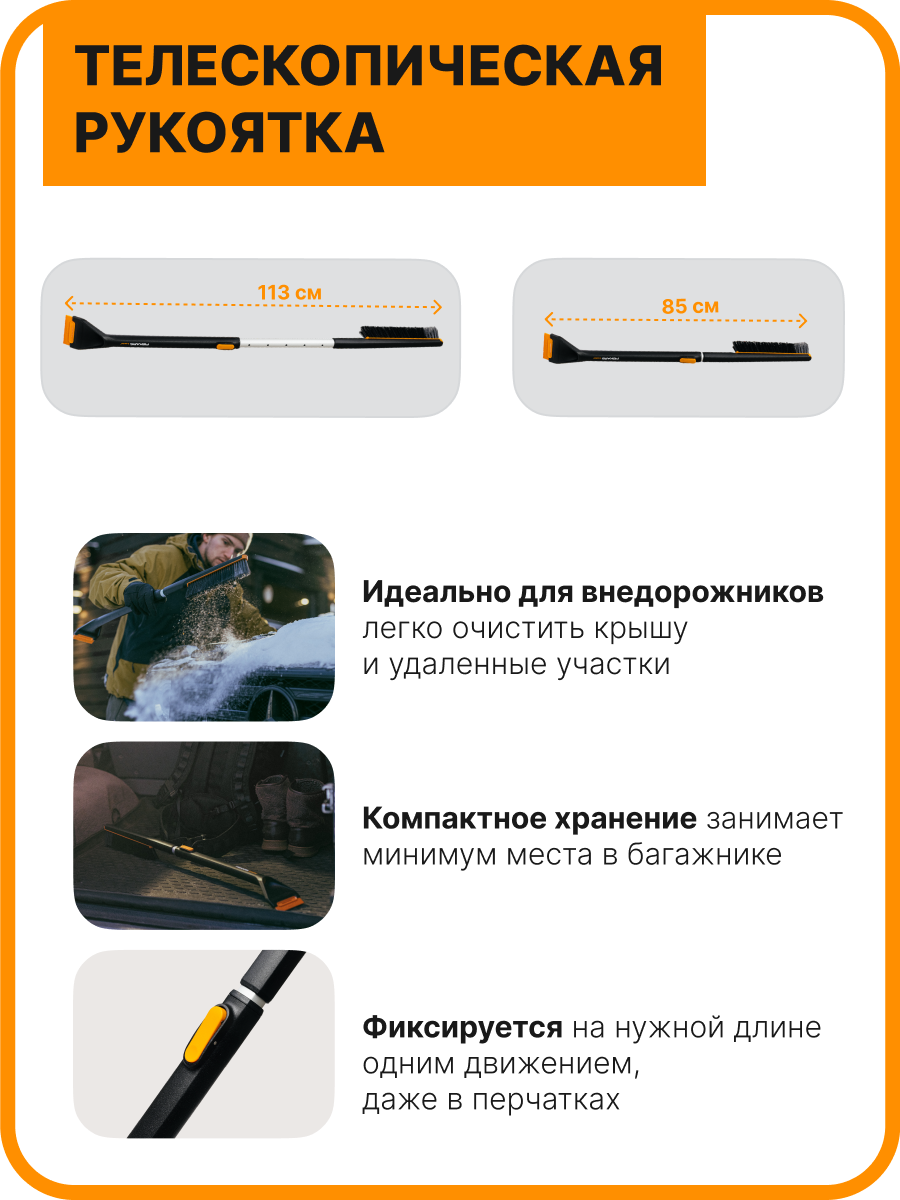 Купить Щетка автомобильная для снега FISKARS 85-113 см телескопическая со скребком X-series (1078493) с доставкой по всей России.
