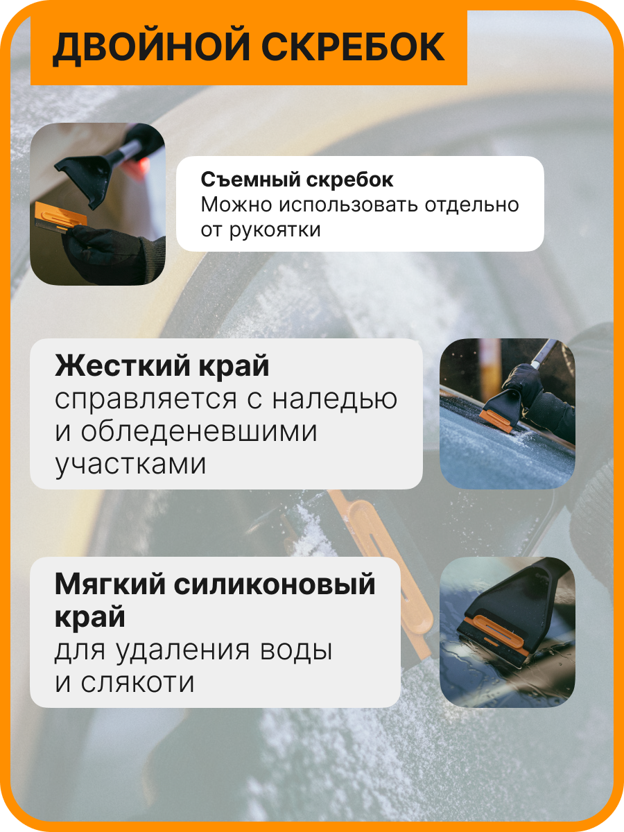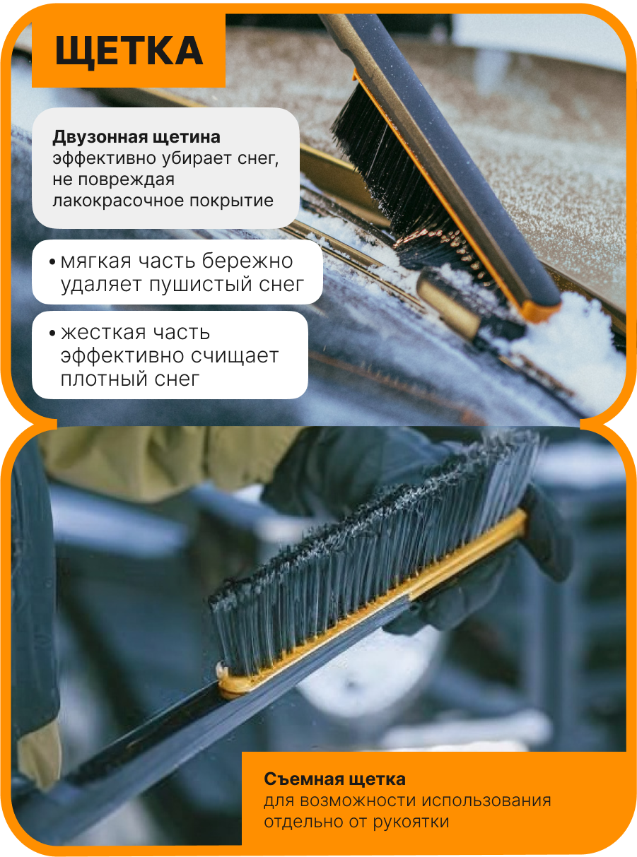 Щетка для уборки снега со скребком FISKARS Plus 63 см (1078495) предназначена для очистки снега и льда с автомобилей и других поверхностей. Щетка автомобильная обеспечивает легкое и удобное удаление снега и льда. Щетка имеет двузонную щетину, которая обеспечивает эффективную уборку снега с бережным отношением к поверхности транспортного средства. Двойной съемный скребок. Твердый край скребка для соскабливания льда, а мягкий силиконовый край - для воды и слякоти. Ширина скребка 9,3 см. Щетка для снега обладает надежной конструкцией, а высококачественные материалы обеспечивают устойчивость к суровым зимним условиям.